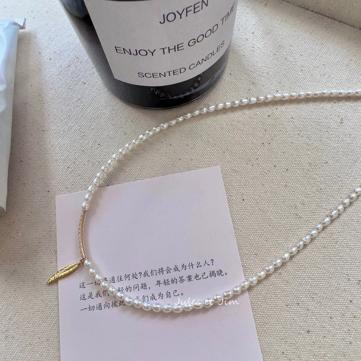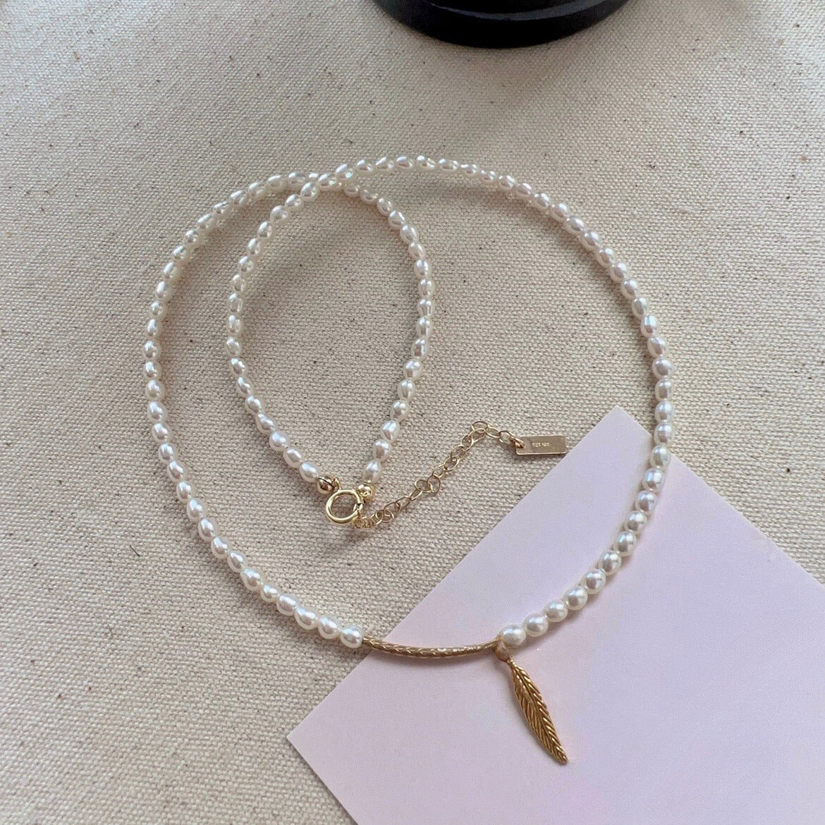 14K Gold Feather Pendant Necklace with Rice Pearl Chain - Elegant Bridal Jewelry - Dainty Wedding Accessory - Minimalist Beaded Charm Necklace, featuring 3-3.5mm high-luster rice-shaped natural pearls. This elegant and minimalist design makes it a perfect accessory for bridal and wedding occasions.