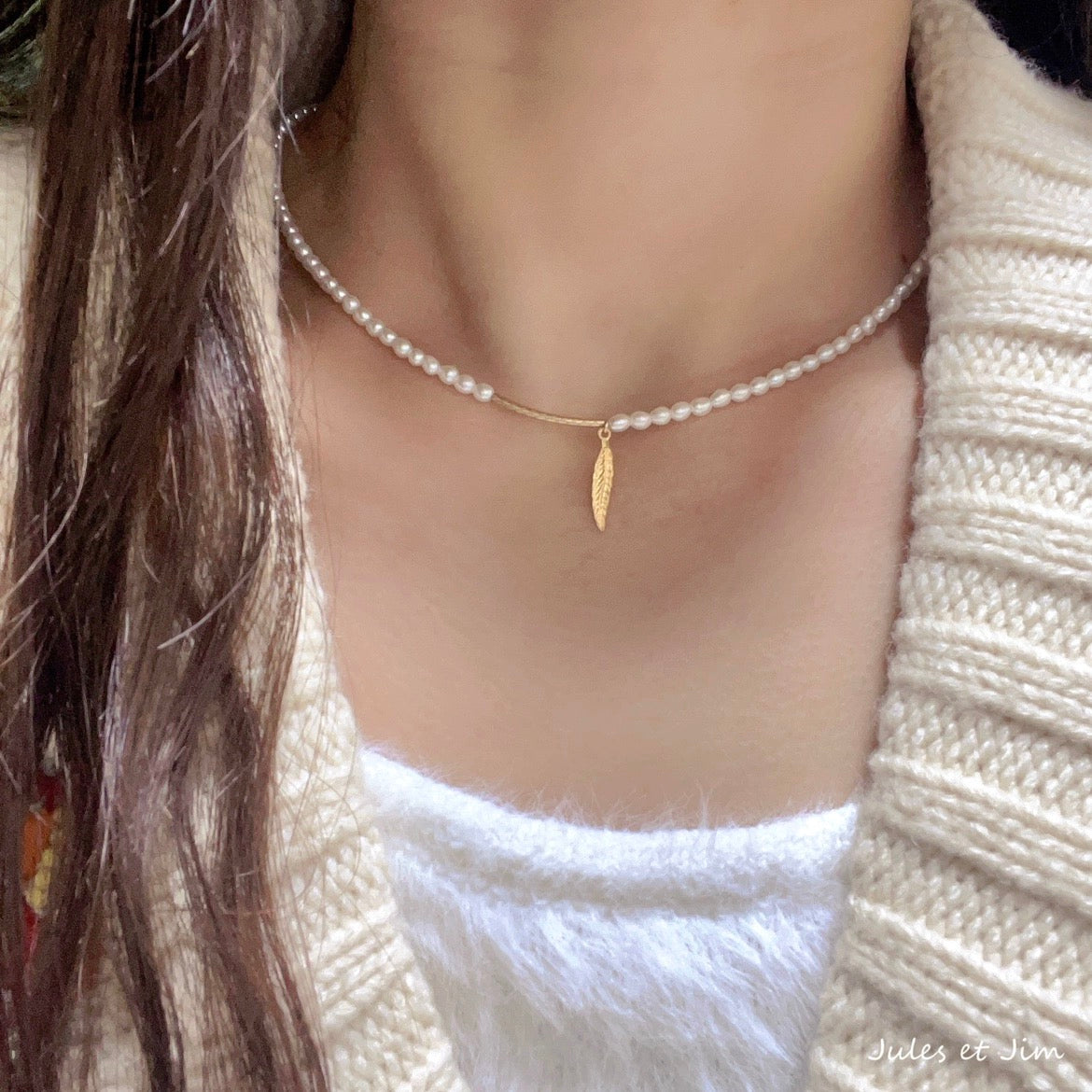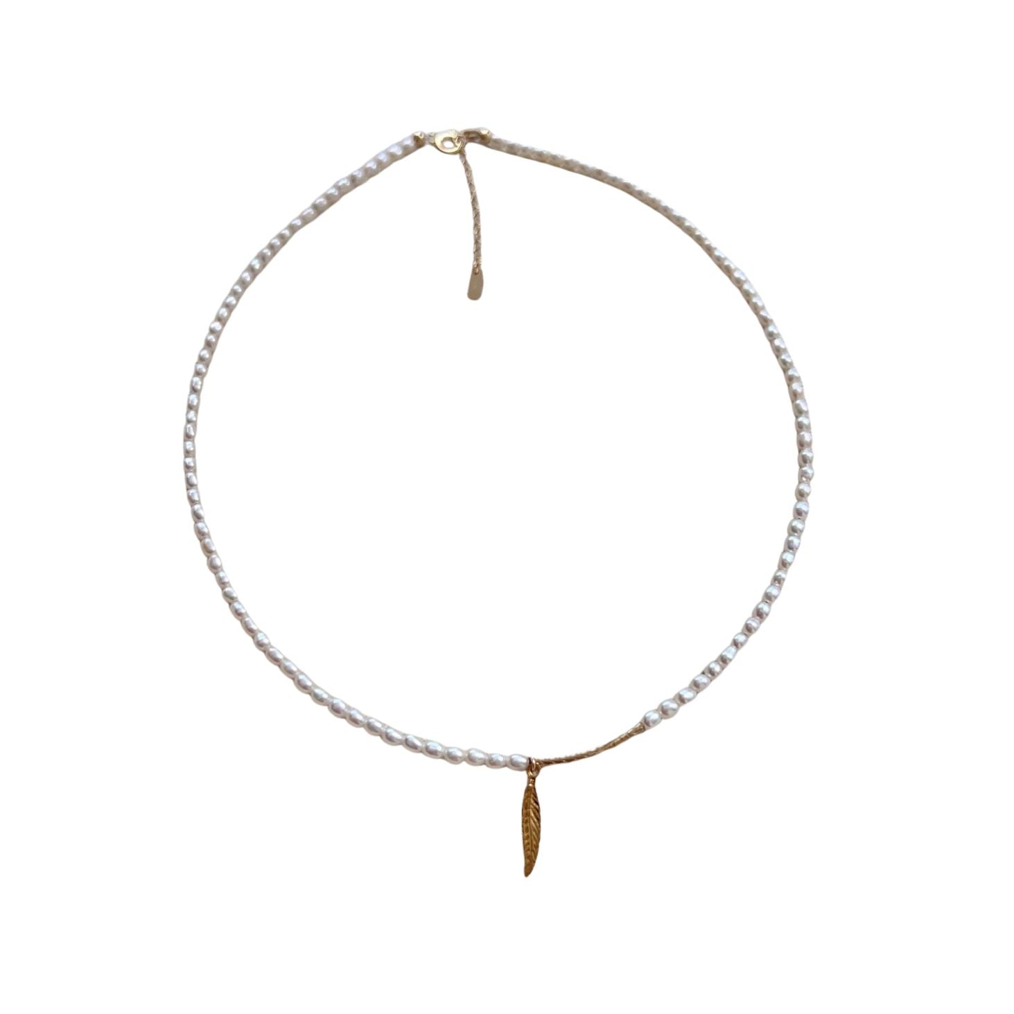 14K Gold Feather Pendant Necklace with Rice Pearl Chain - Elegant Bridal Jewelry - Dainty Wedding Accessory - Minimalist Beaded Charm Necklace