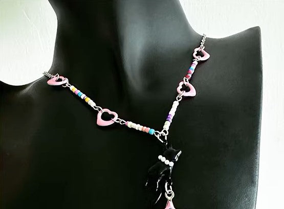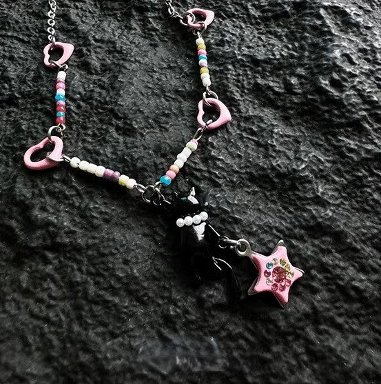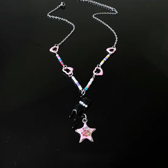 Adorable Cat and Star Pendant Beaded Necklace, Girly Style, Interesting Design, Special Gift. Niche Style
