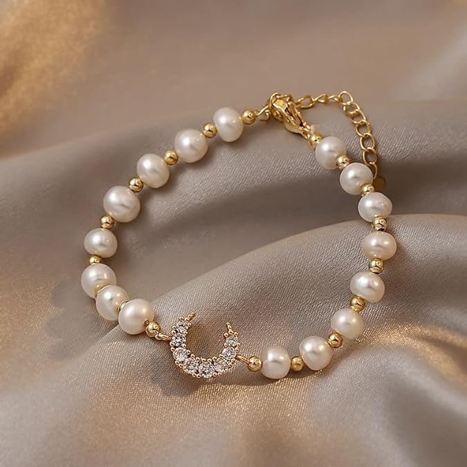 ✨Unique Design: This asymmetrical bracelet features freshwater pearls and micro-inlaid zircon stones arranged in a vintage European and American inspired moon shape pattern.