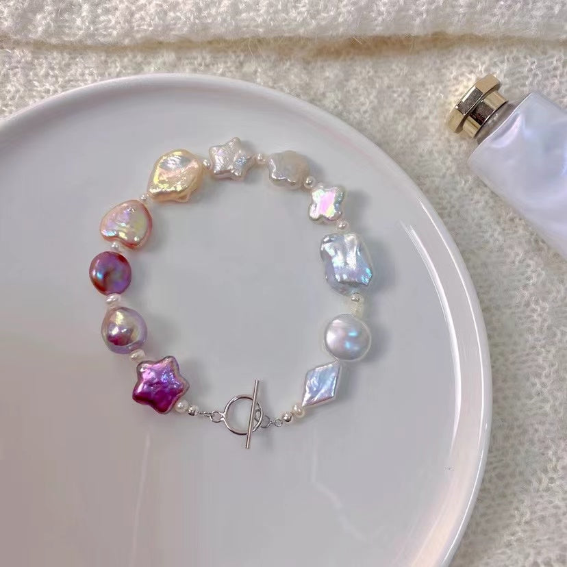 Baroque Pearl and Multicolored Gemstone Bracelet with Star and Heart Charms - Handcrafted Elegance