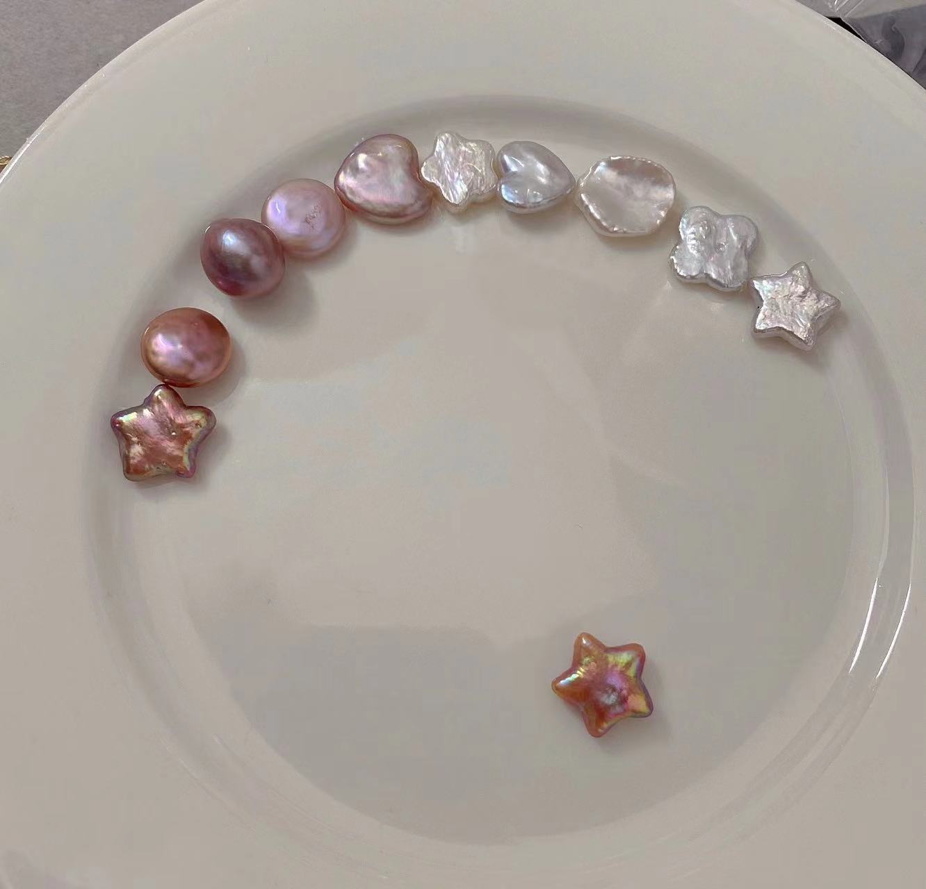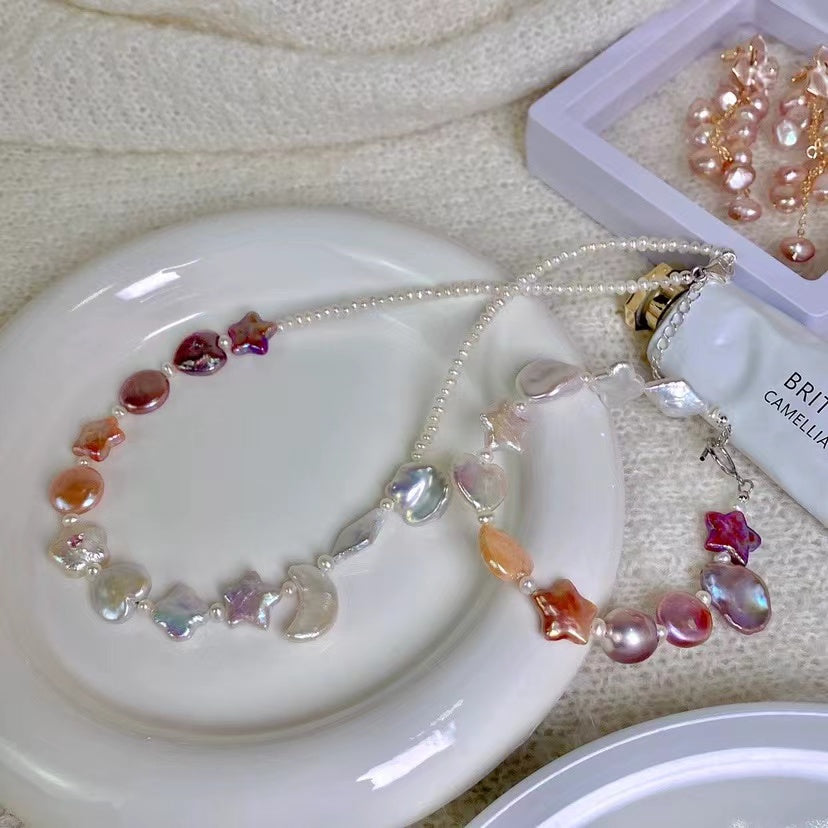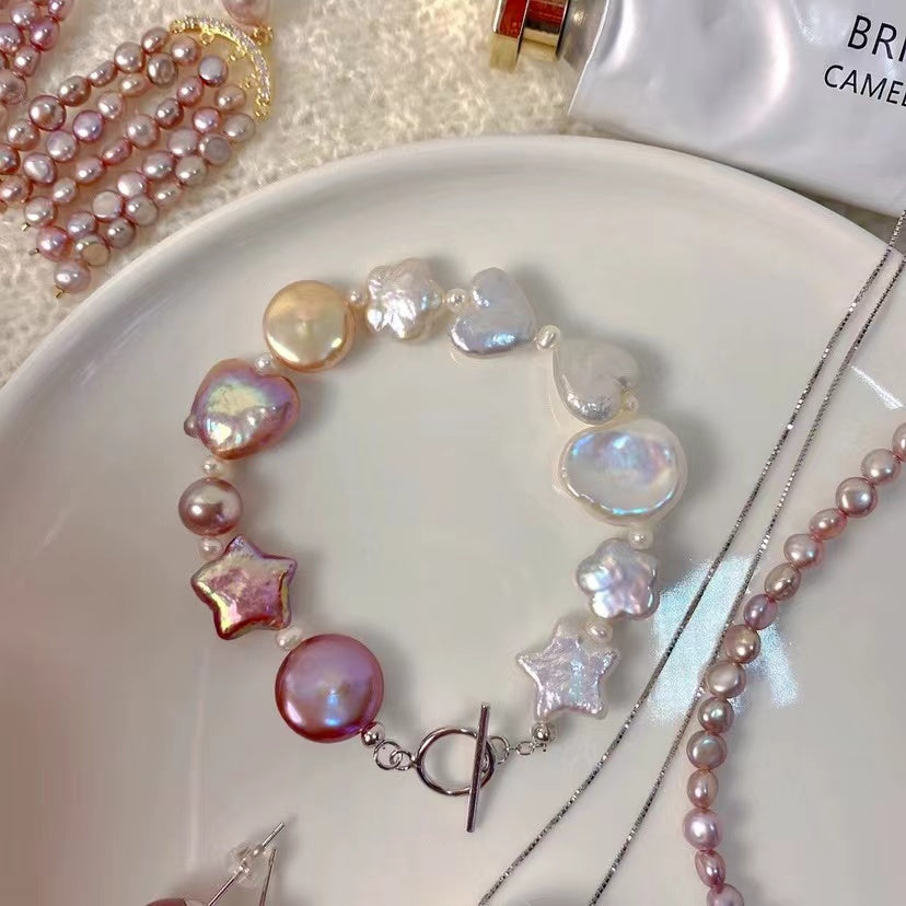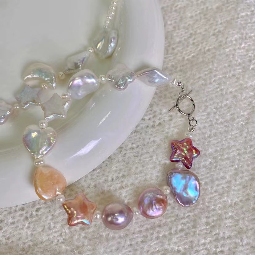 The bracelet is made from various baroque pearls, each with a unique shape and luster. It is adorned with multicolored gemstones and charming star and heart pendants. The bracelet can be customized in length by contacting customer service, ensuring a perfect fit for any wrist.