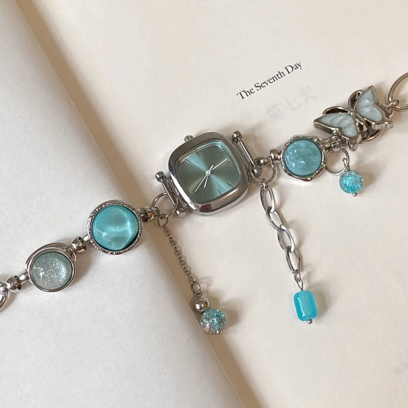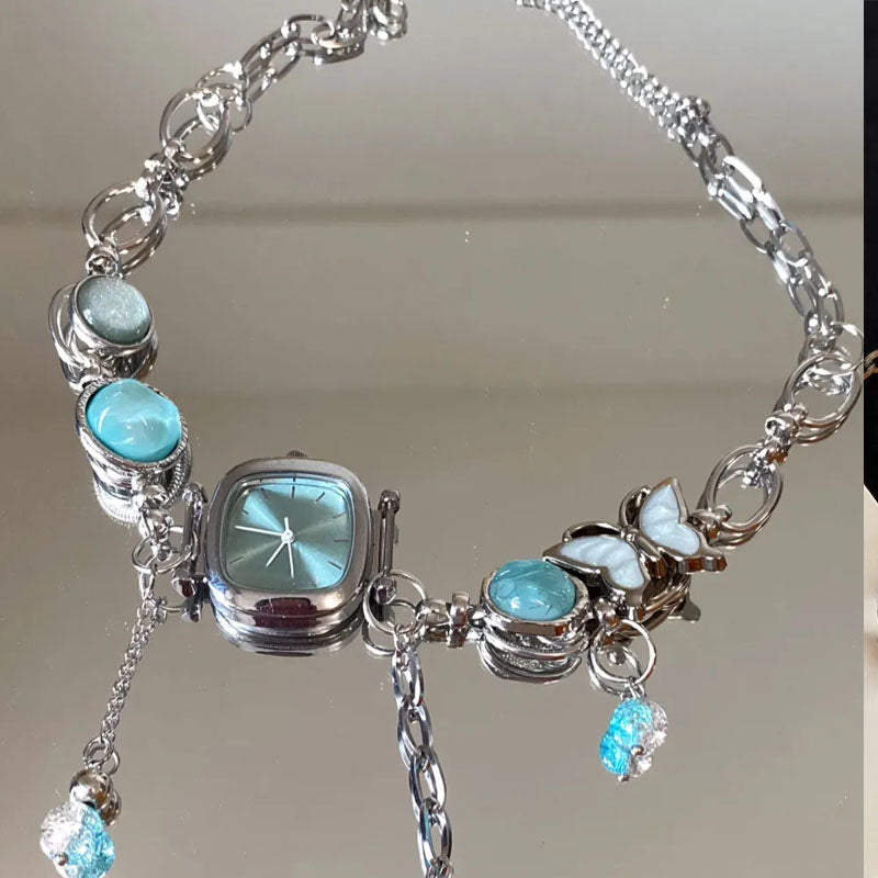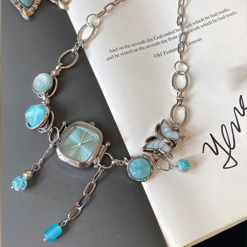 Cyber Punk Vintage Button Bead Blue Watch Choker, Butterfly Titanium Steel Chunky Chain Necklace,Y2KAccessories, Perfect Unique Handmade Gift