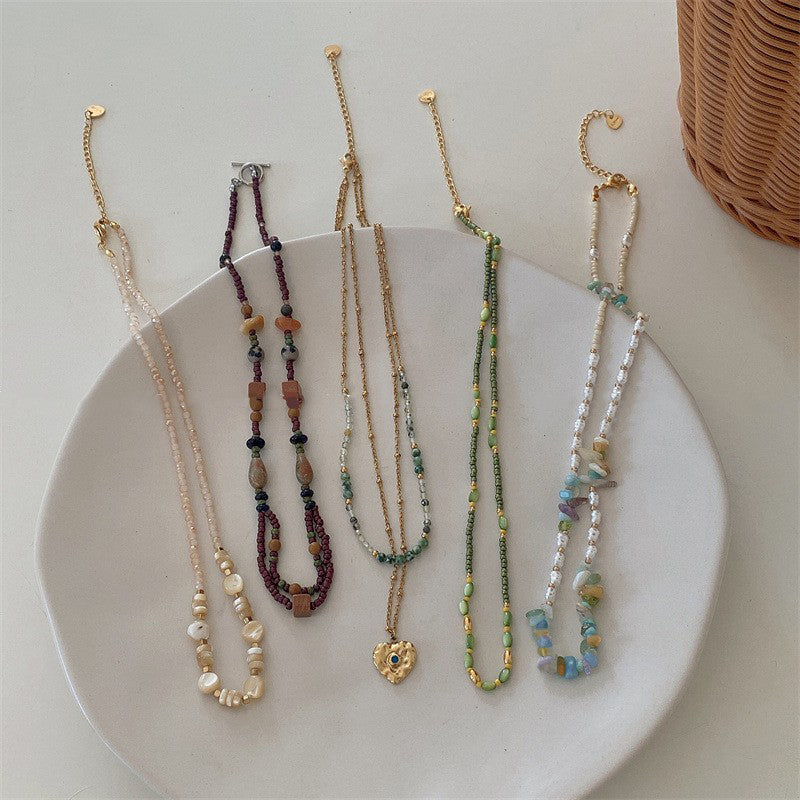 Bohemian Gold-Plated Green Heart Necklace, Shell and Wood Beads, Natural Stone Collar