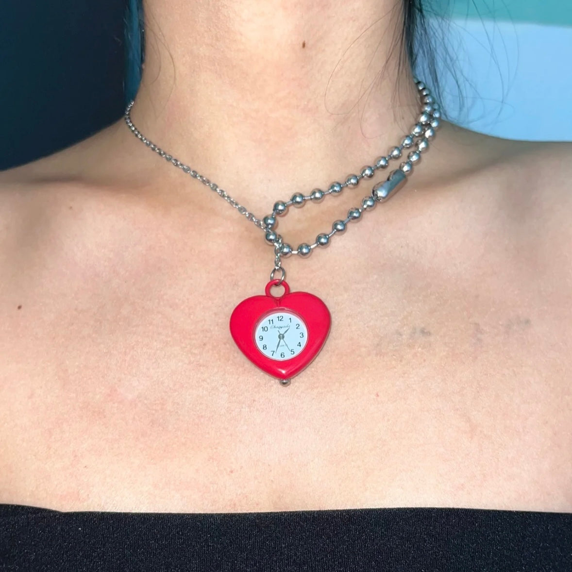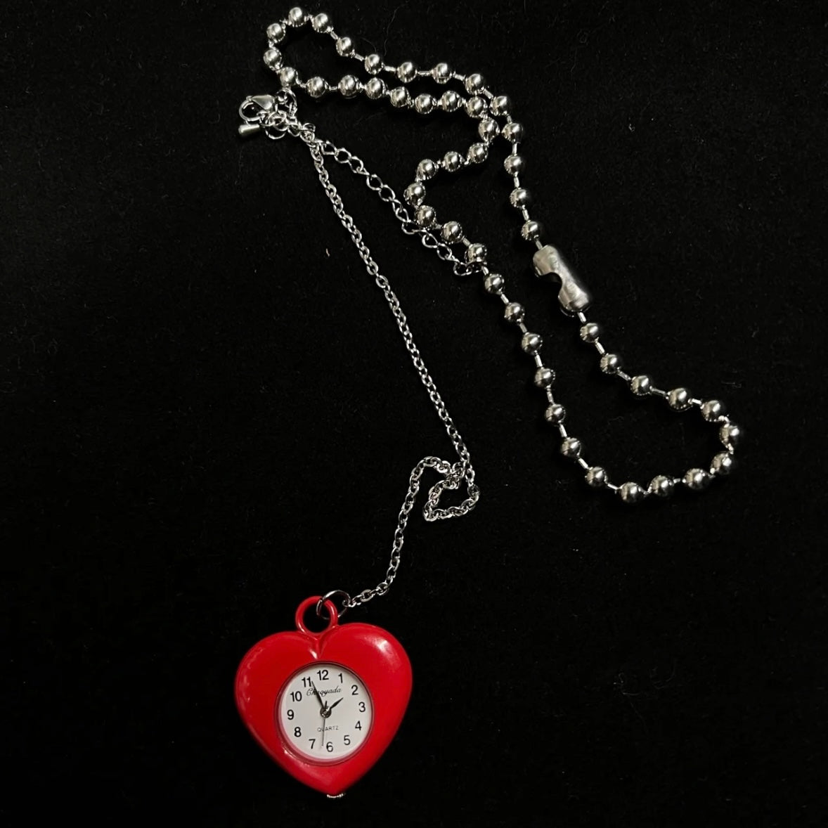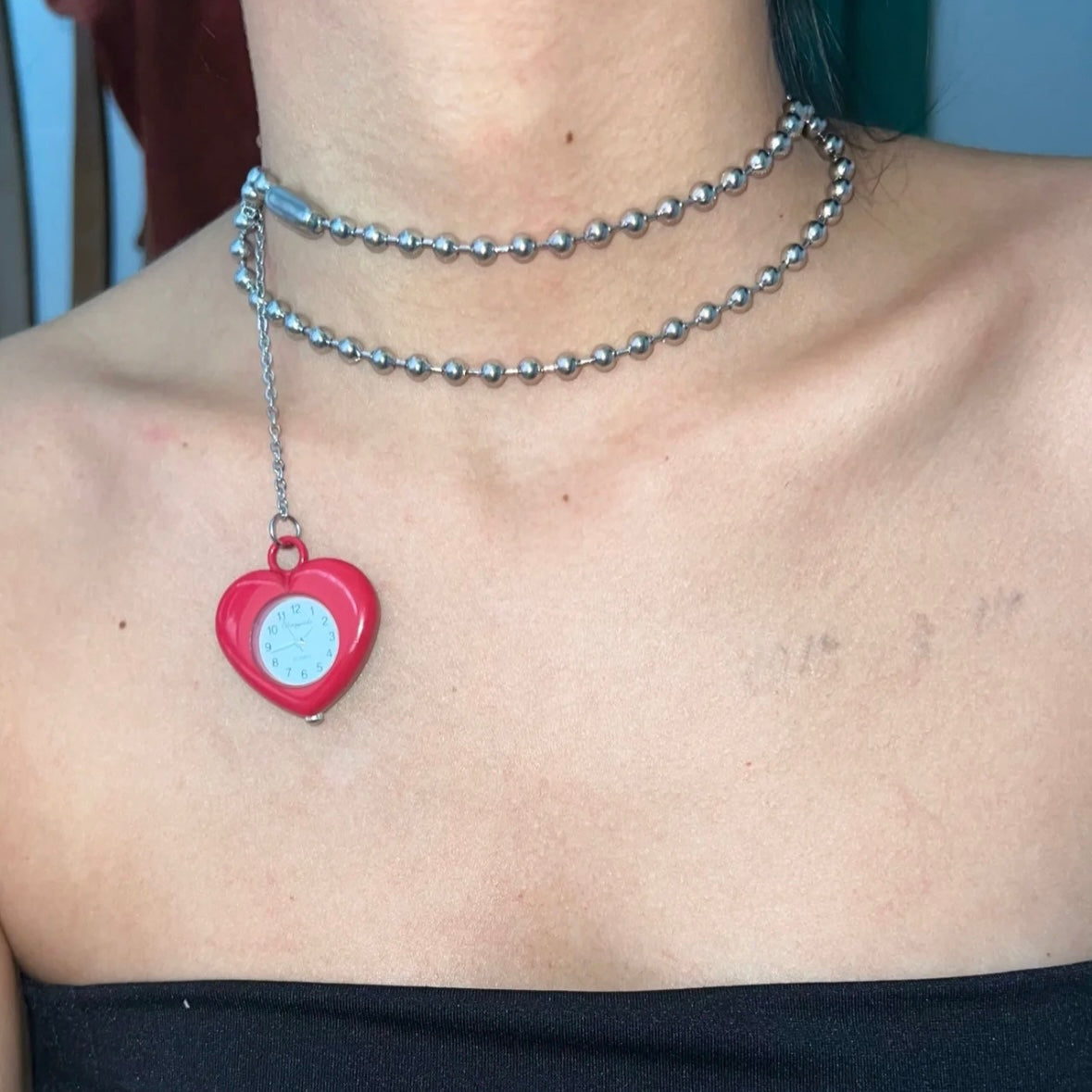 Chunky Puffy Red Heart Shape Watch Choker Cute Niche Punk Adjustable Necklace Long Silver Chain