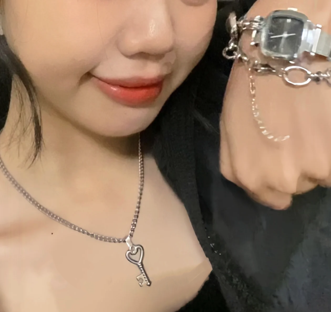 Cyberpunk silver watch chunky chain necklace & bracelet (two ways to wear), key pendant layered necklace, trendy and cool, Y2K necklac