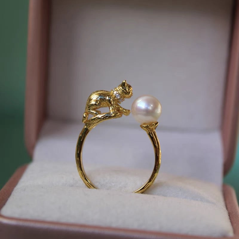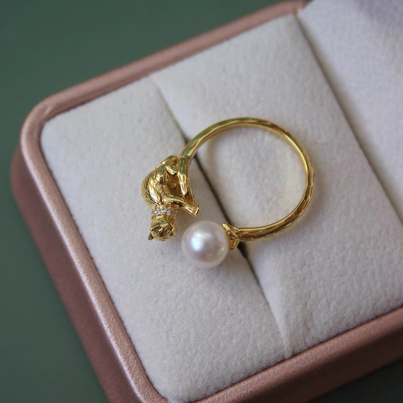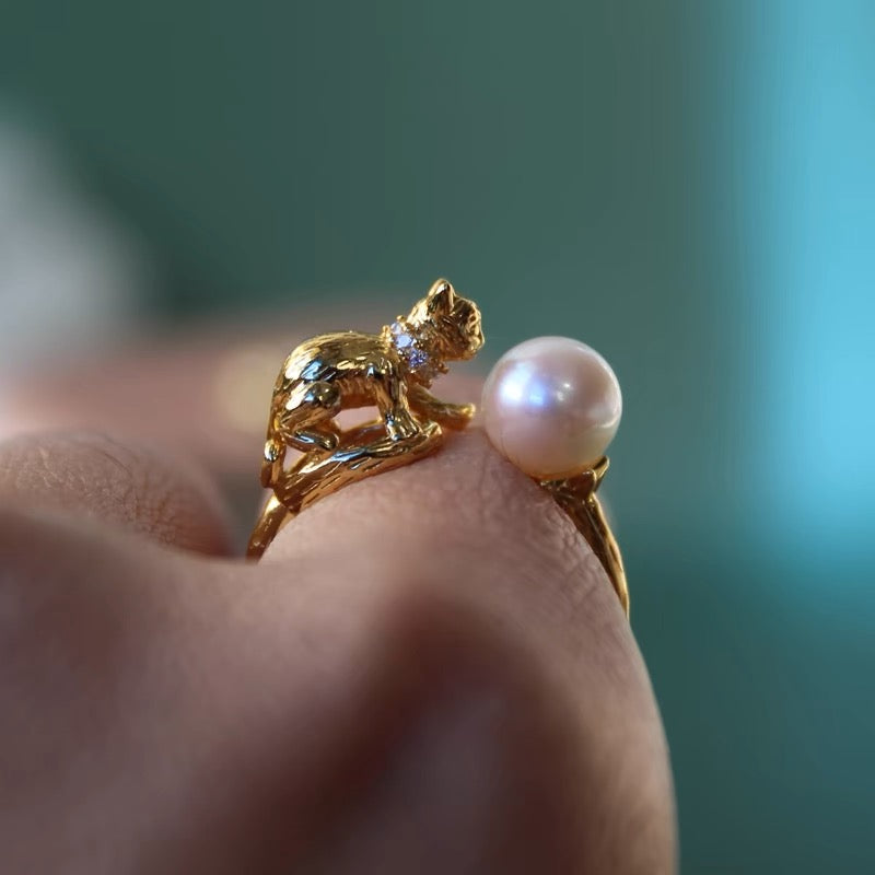 Cute Kitten Cat Pearl Ring Lovely Adorable Open Adjustable Gold Plated 925 Silver Ring Charm Sterling Jewelry