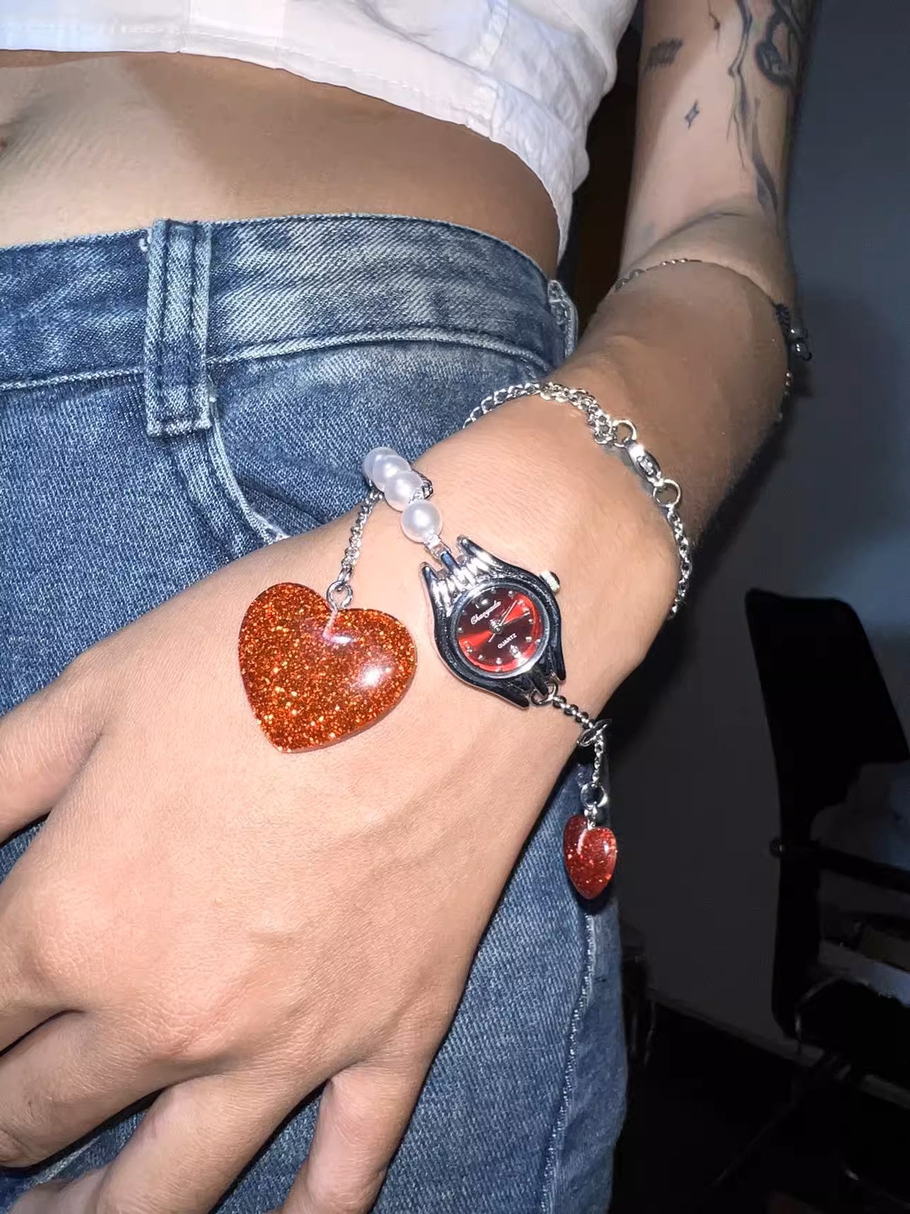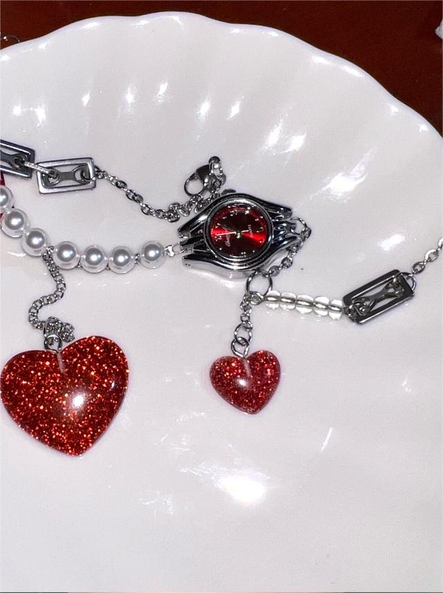 Vintage Punk Niche Red Watch Pearl Choker, Red Heart, Butterfly Pendant Fringe Necklace, Y2K Metallic Jewelry , Handmade Gift For Her