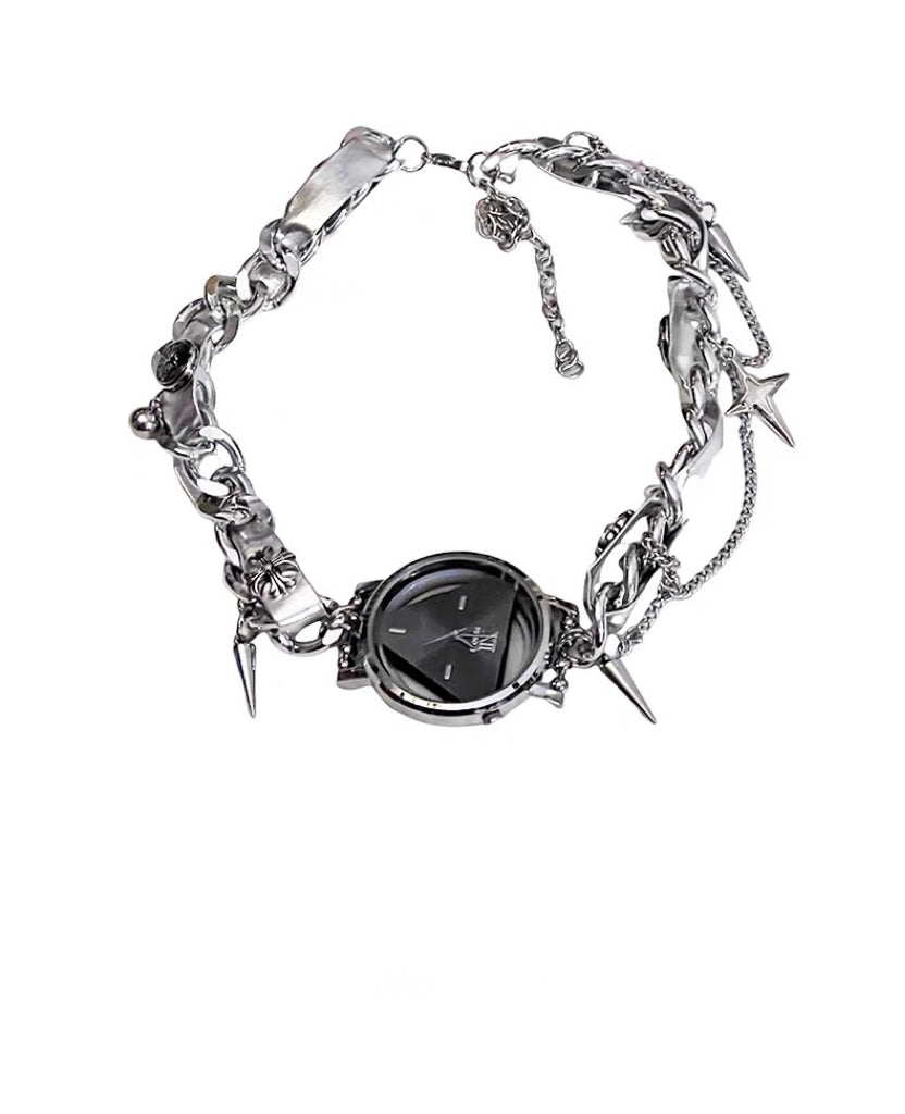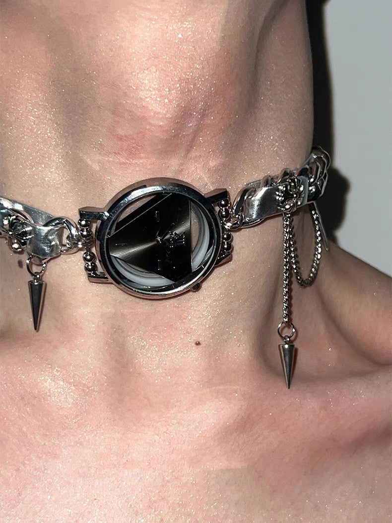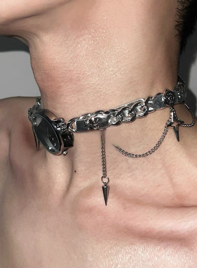 Features with a watch in the middle and set with various of gemstone, this necklace is a stunning combination of elegance and functionality, that adds a touch of cyber punk to your daily outfit. This special creative choker is a must-have for your jewelry wardrobe, sure to make a statement and catch everyone's attention.