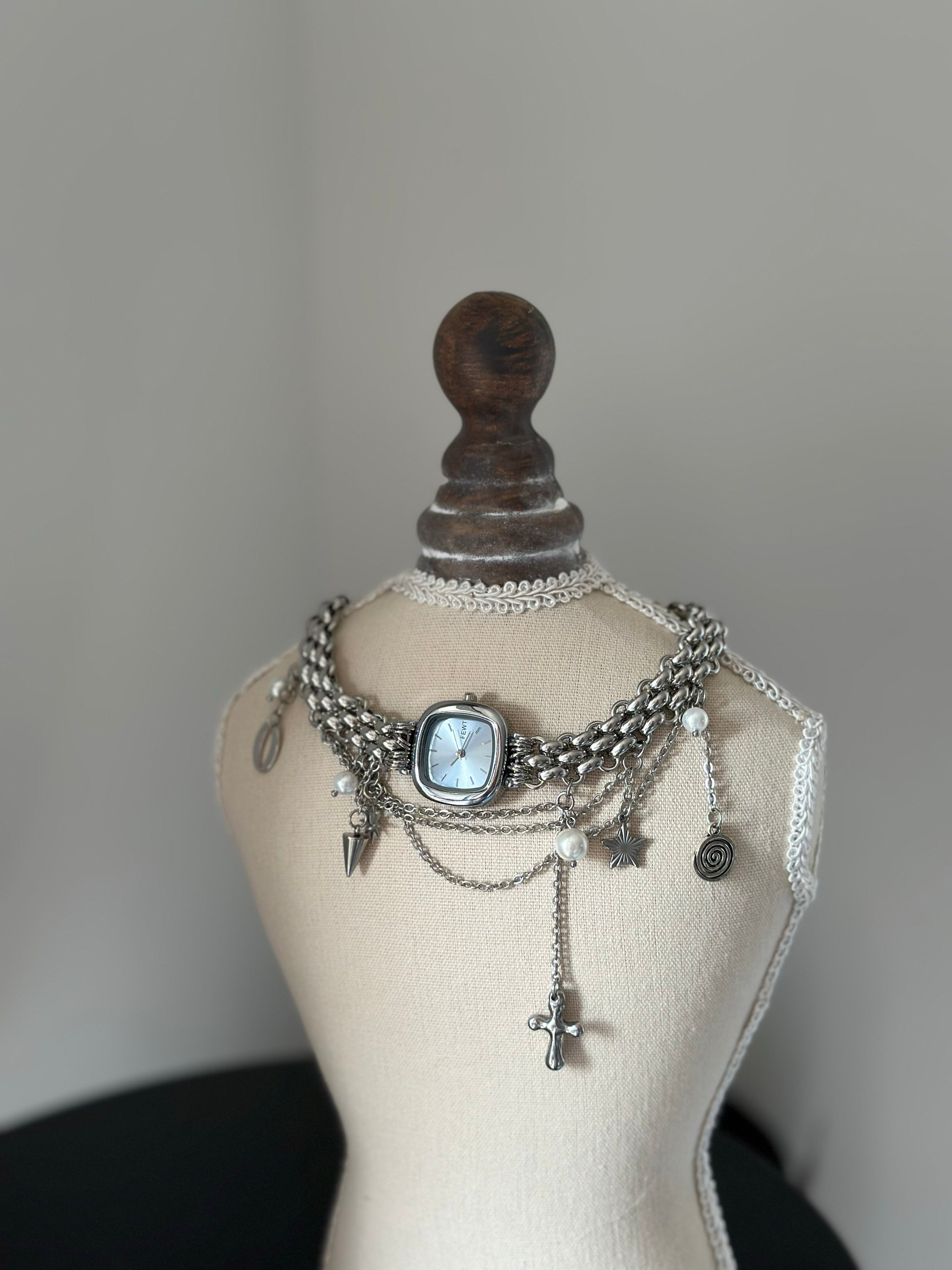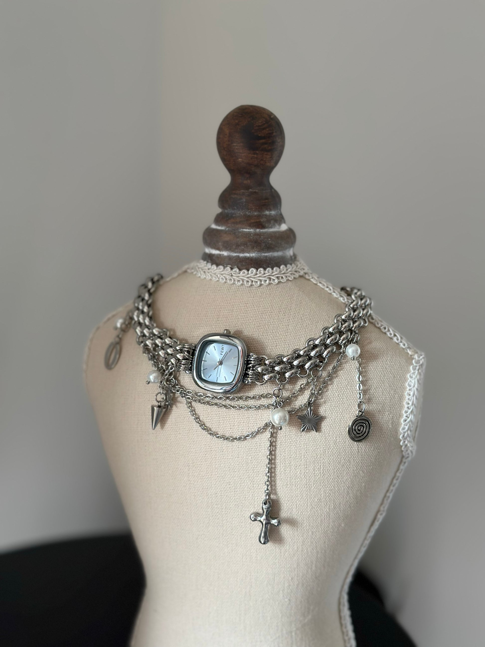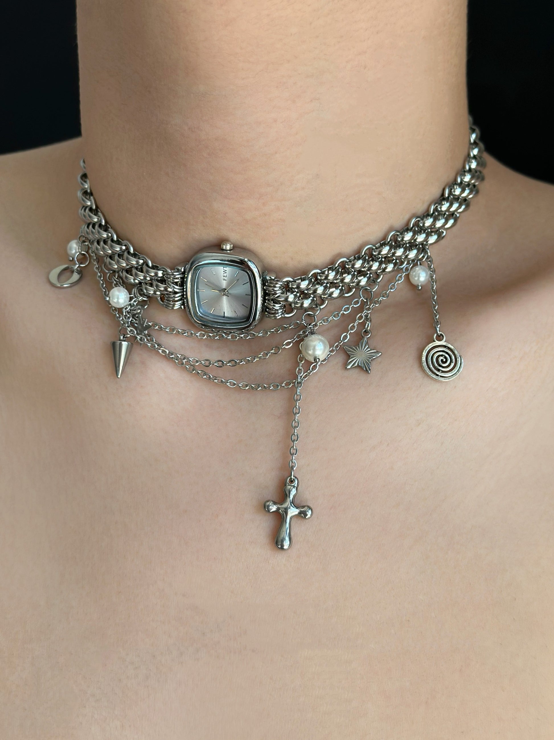 Features with a watch in the middle and set with various of shell pearl, this necklace is a stunning combination of elegance and functionality, that adds a touch of cyber punk to your daily outfit. This special creative choker is a must-have for your jewelry wardrobe, sure to make a statement and catch everyone's attention.