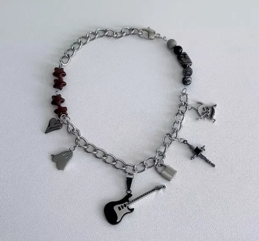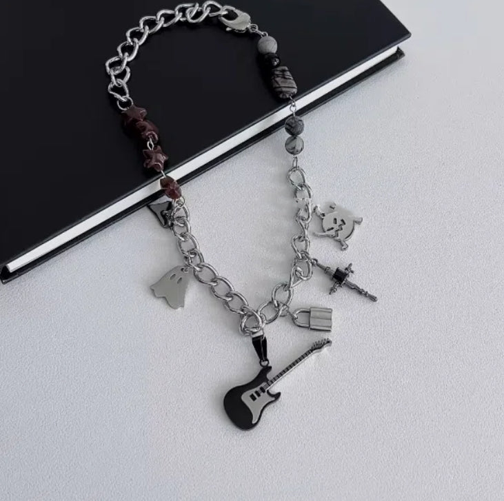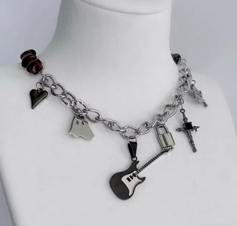 Cyberpunk guitar pendant necklace, silver chunky chain choker, adorned with cross and locks in a multi-element design.unisex choker.