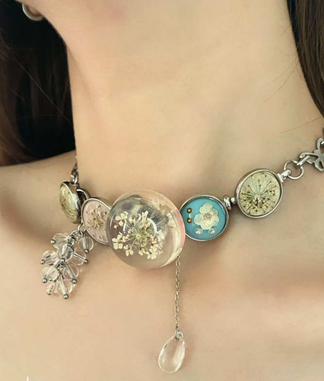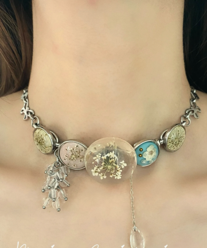 Cyberpunk Retro Choker Necklace, Silver Dried Flower Specimen Pendant Choker, Y2K Choker, stylish and cool, niche appeal
