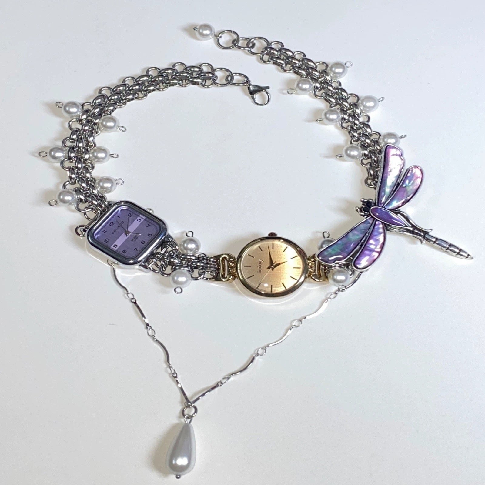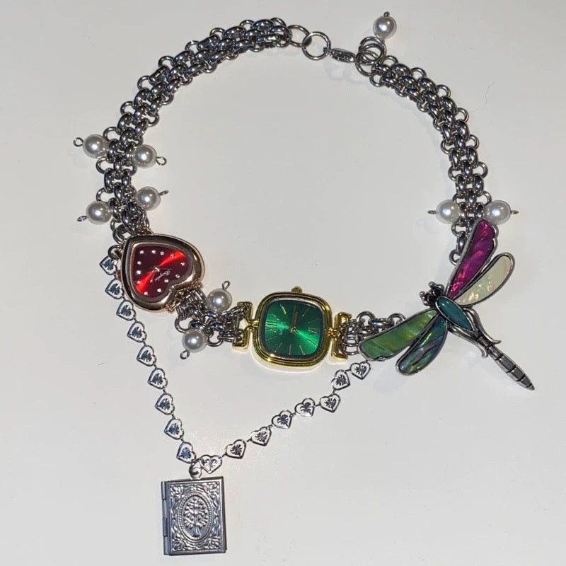 Cyberpunk retro colorful watch choker necklace,dragonfly, buttefly charm chunky chain, layered pearl and heart necklace, Y2K clock jewelry