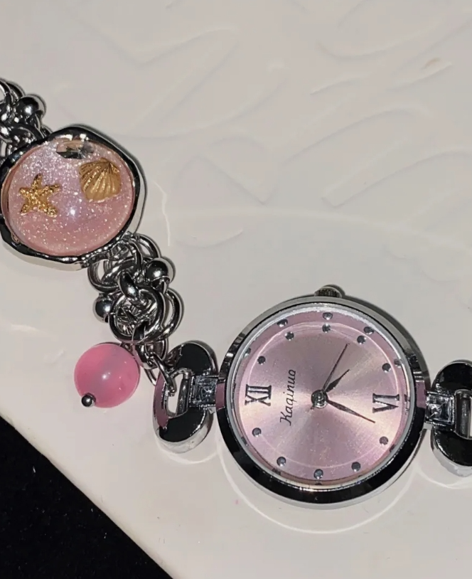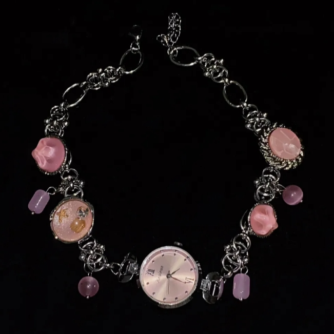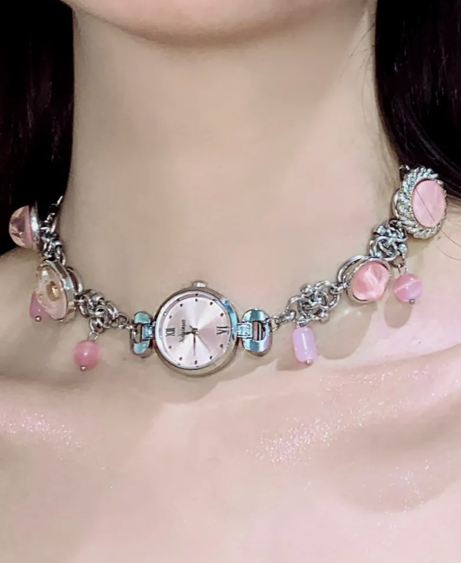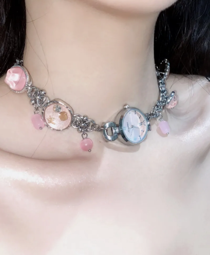 Cyberpunk Retro Pink Watch Choker Necklace, Silver Watch Pendant Choker, Y2K Choker, Stylish and Cool