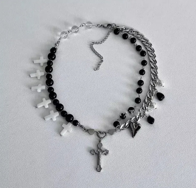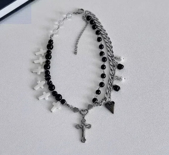 Cyberpunk, silver double-layer cross pendant necklace, decorated with cross and obsidian,Y2Kchoker,punk style,perfect gift,unisex choker