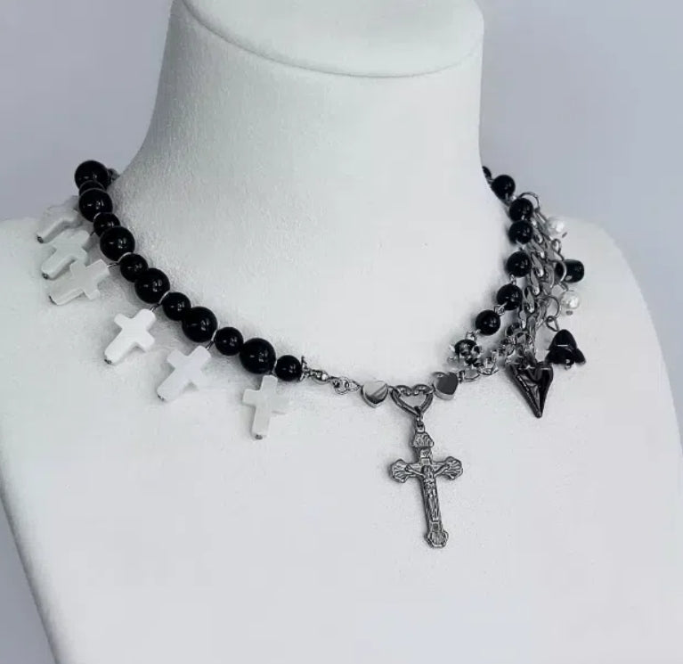 This is a Cyberpunk-style Cross pendant necklace, with a silver double-layer chain, adorned with a cross and obsidian decorations, embodying a Punk style.