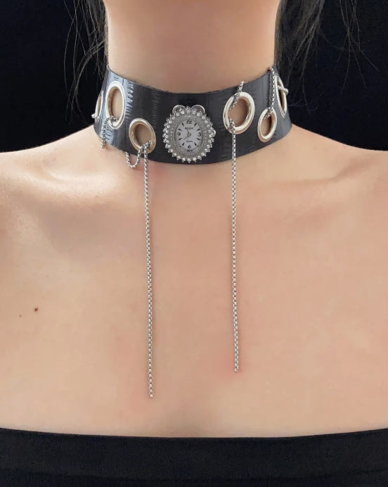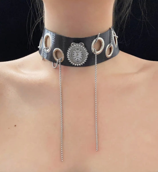 This is a Gothic-style choker with a watch pendant, reflecting a unique and niche style.