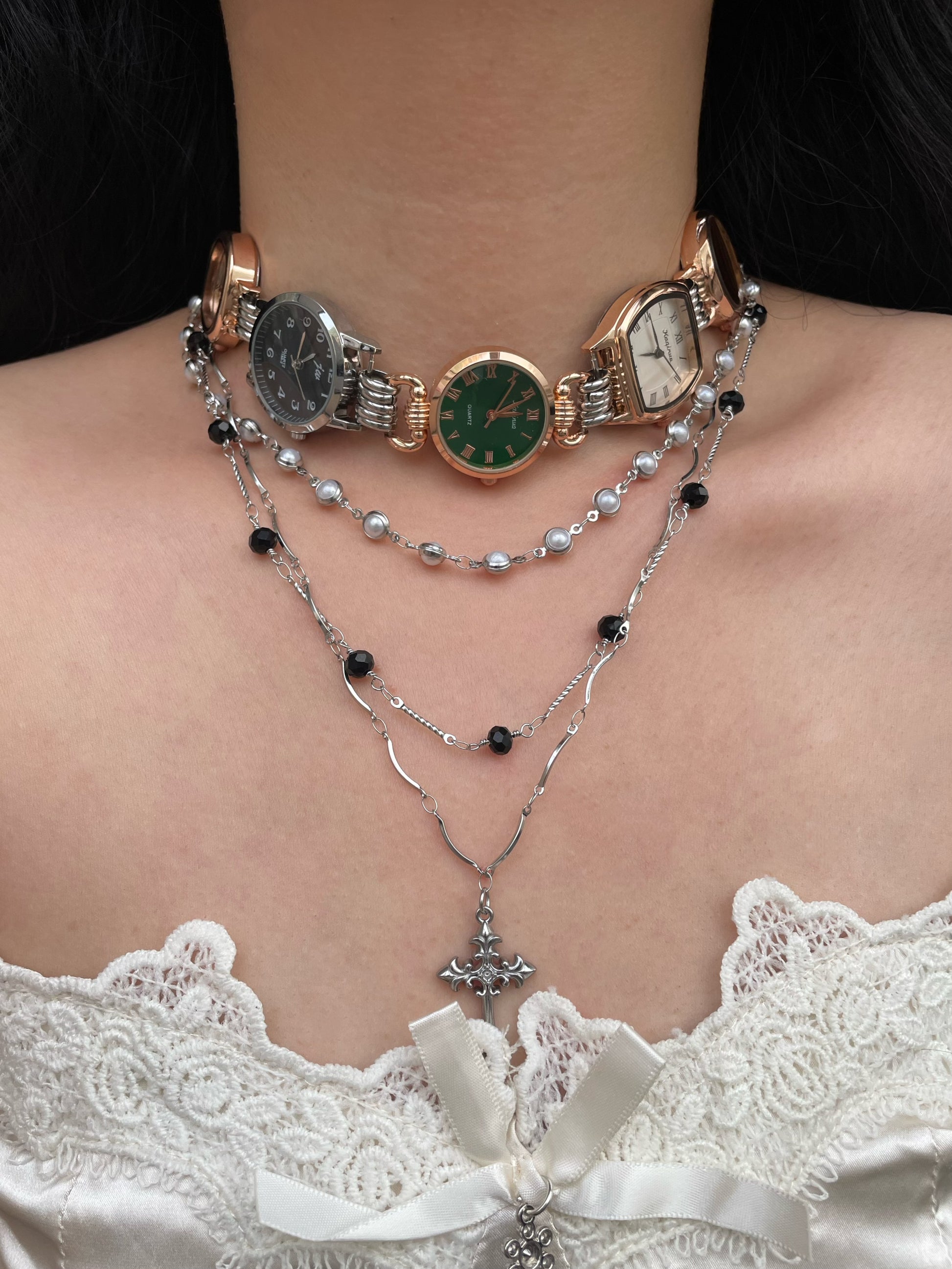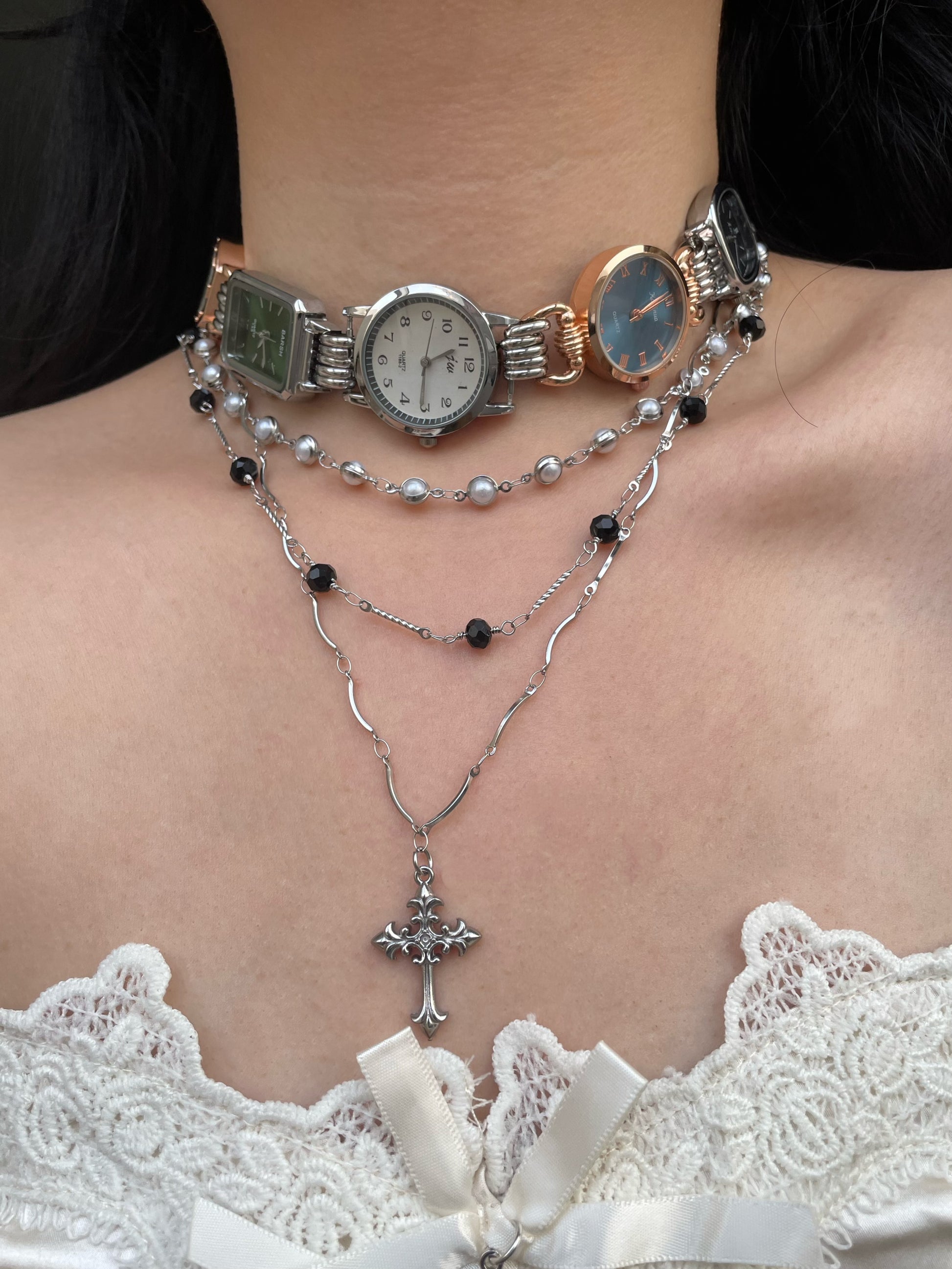Five watches multi-colored watch choker, cross layered necklace