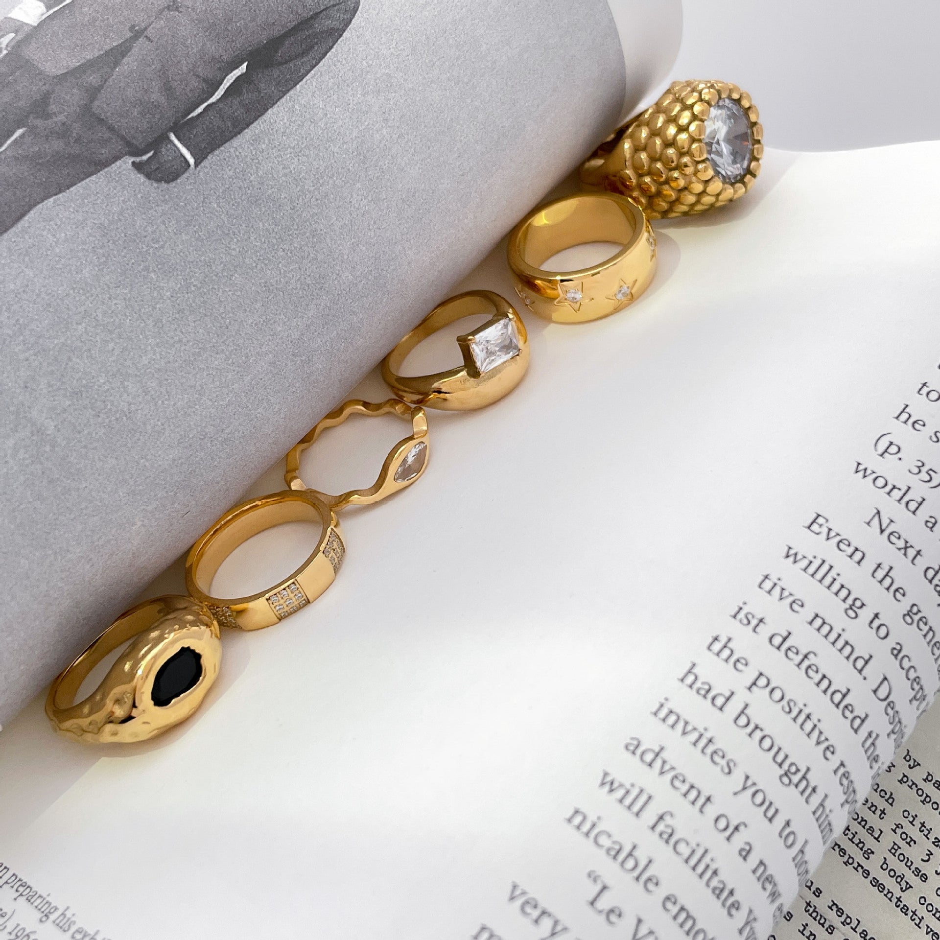 Unleash the allure of modern sophistication with our Floral Core Zircon Ring, a statement piece that combines the elegance of black zircon stones with the intricate design of a wave-patterned star. This titanium steel ring, plated in 18K gold, is perfect for those who appreciate the fusion of bold style and luxurious materials.