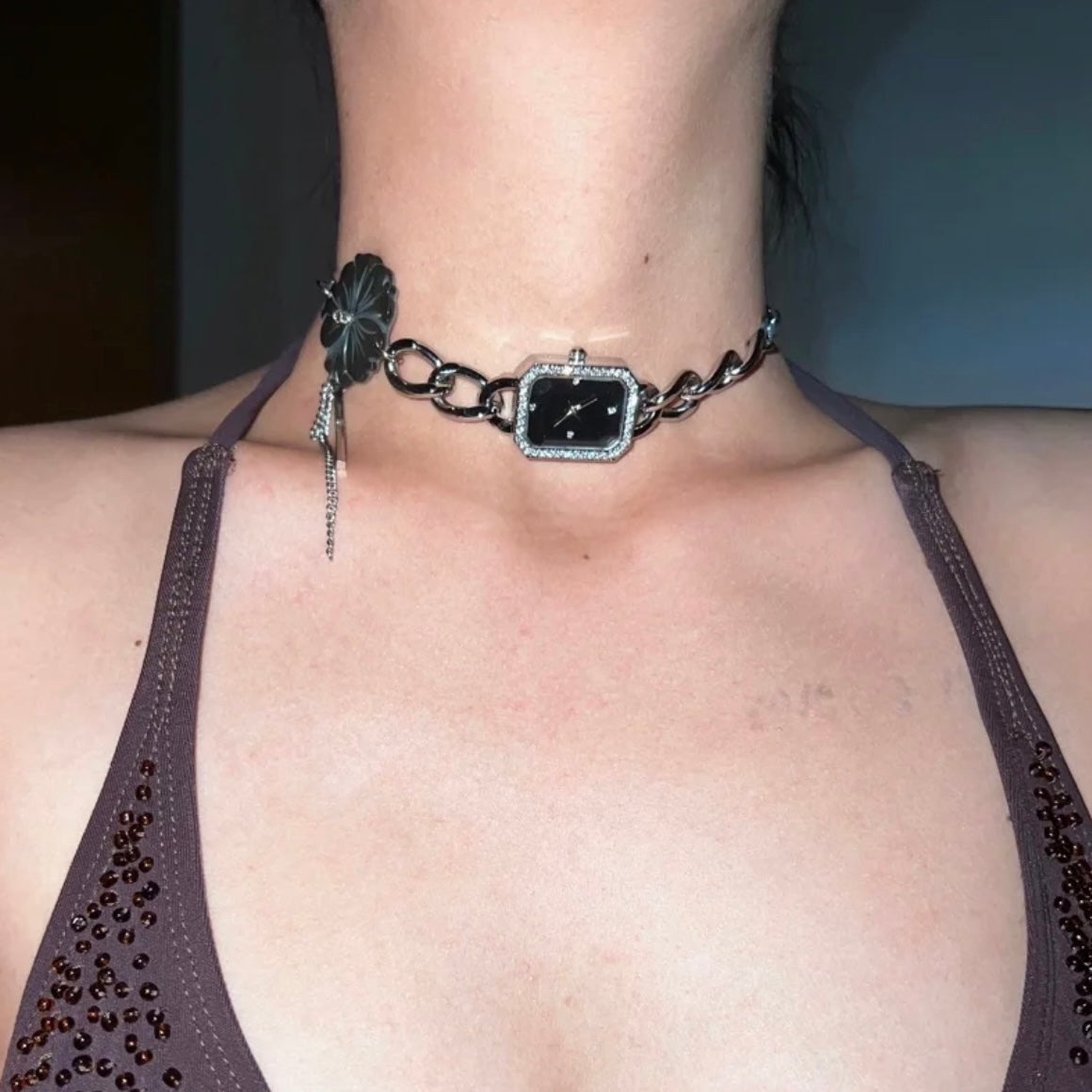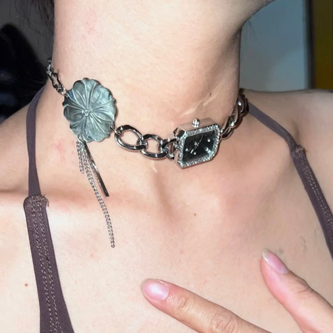 Flower Floral Watch Choker Y2K Niche Chunky Punk Necklace Silver Chain Vintage Jewelry