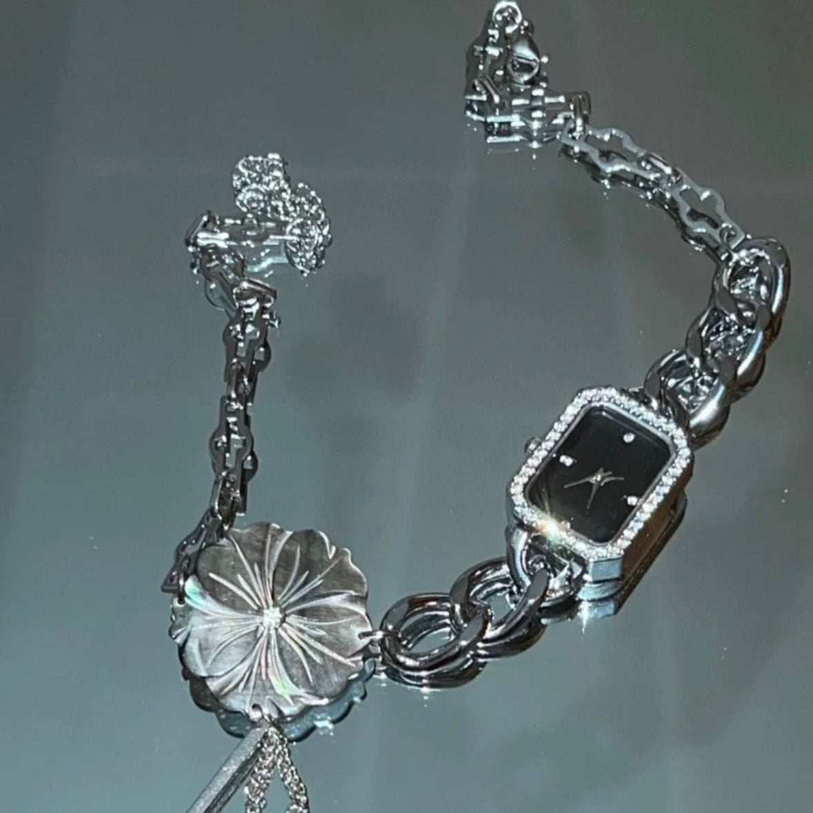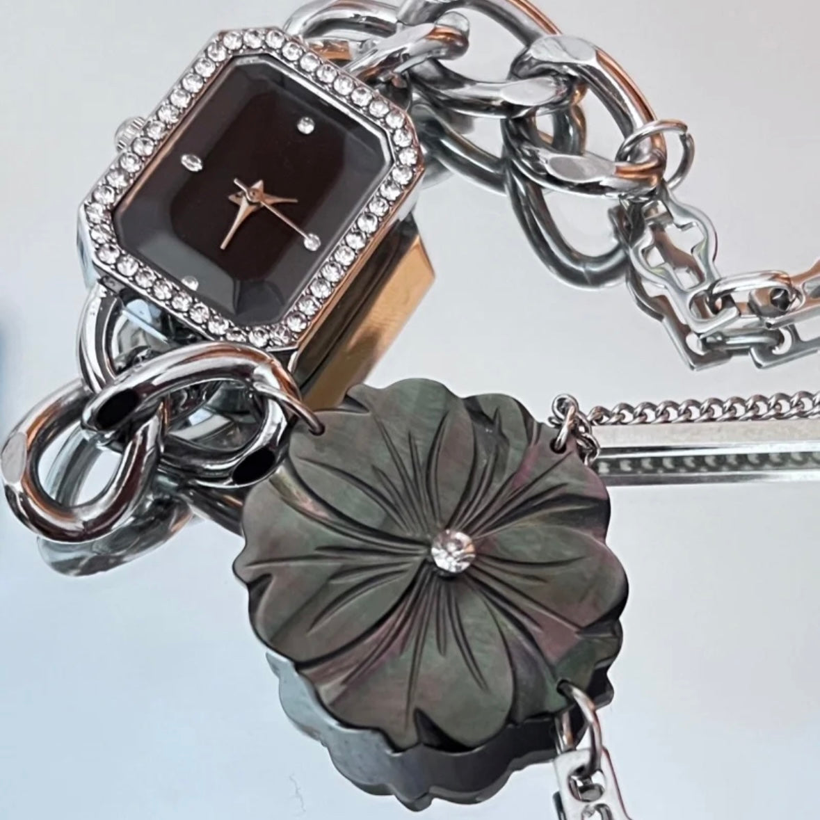 Embrace mysterious with our floral-inspired necklace. Featuring a floral pendant and shiny watch, it adds a touch of edge and uniqueness to any outfit.