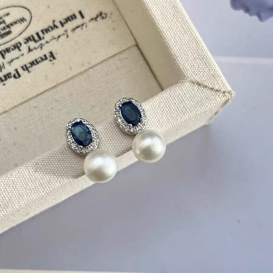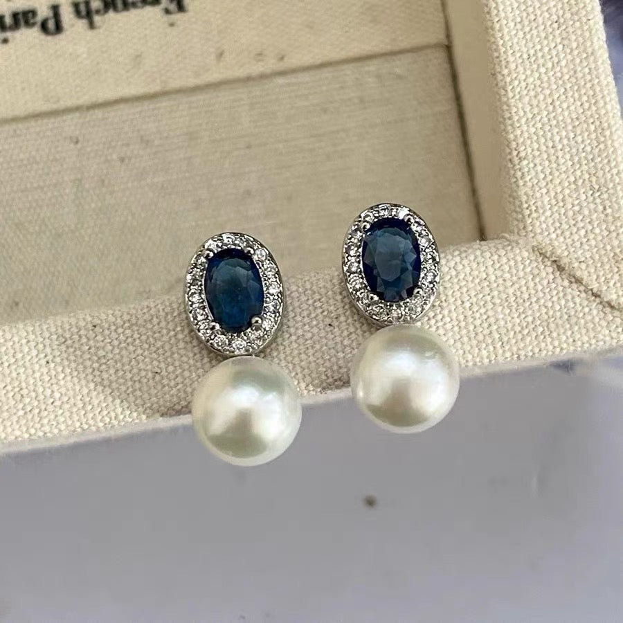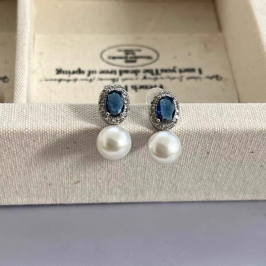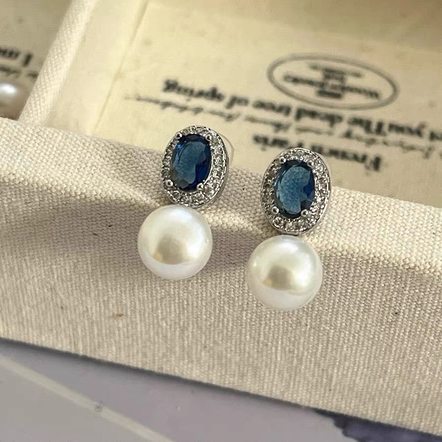The sterling pearl earrings exude an elegant classical charm. Each earring is adorned with exquisite shiny blue rhinestone, complemented by round natural pearls. Its unique and delicate design showcases a perfect blend of vintage and modern, adding a touch of distinctive charm to your ears.
