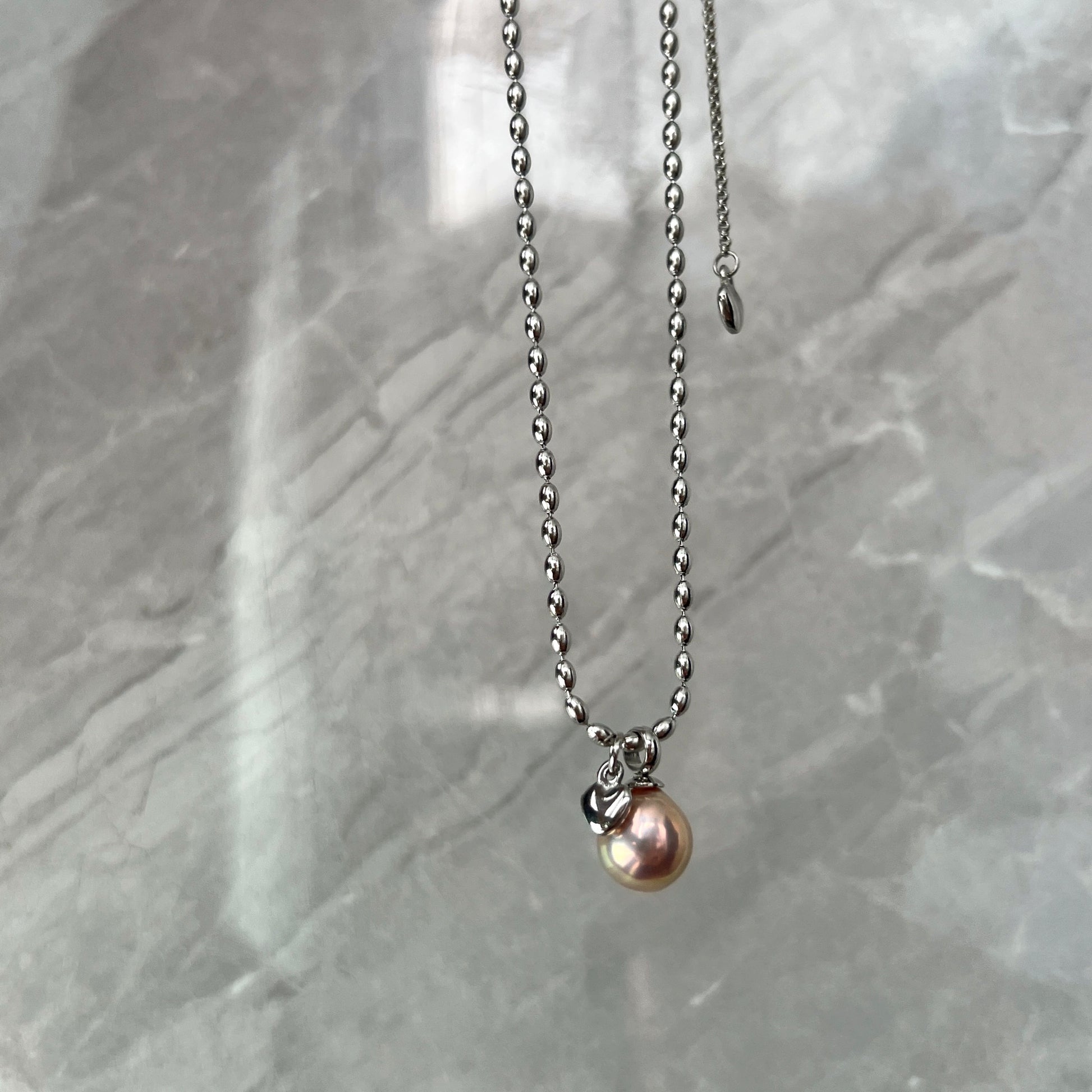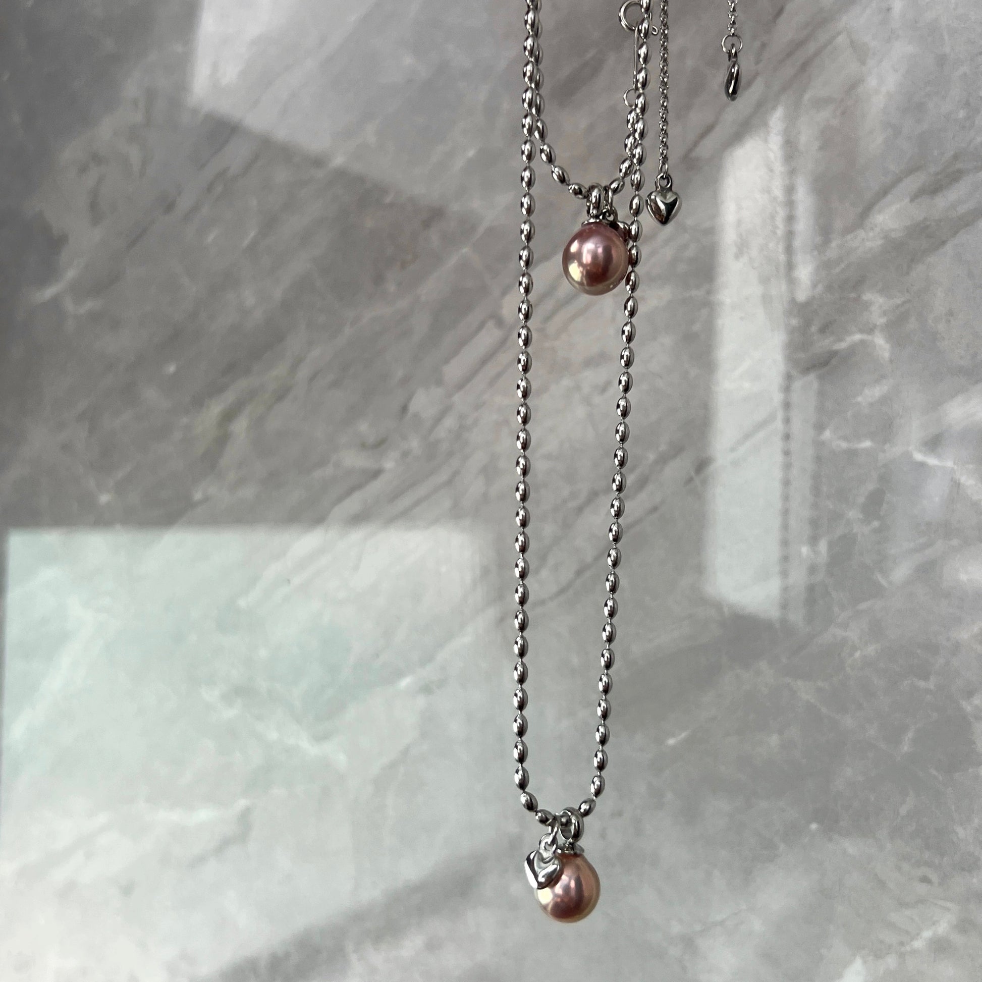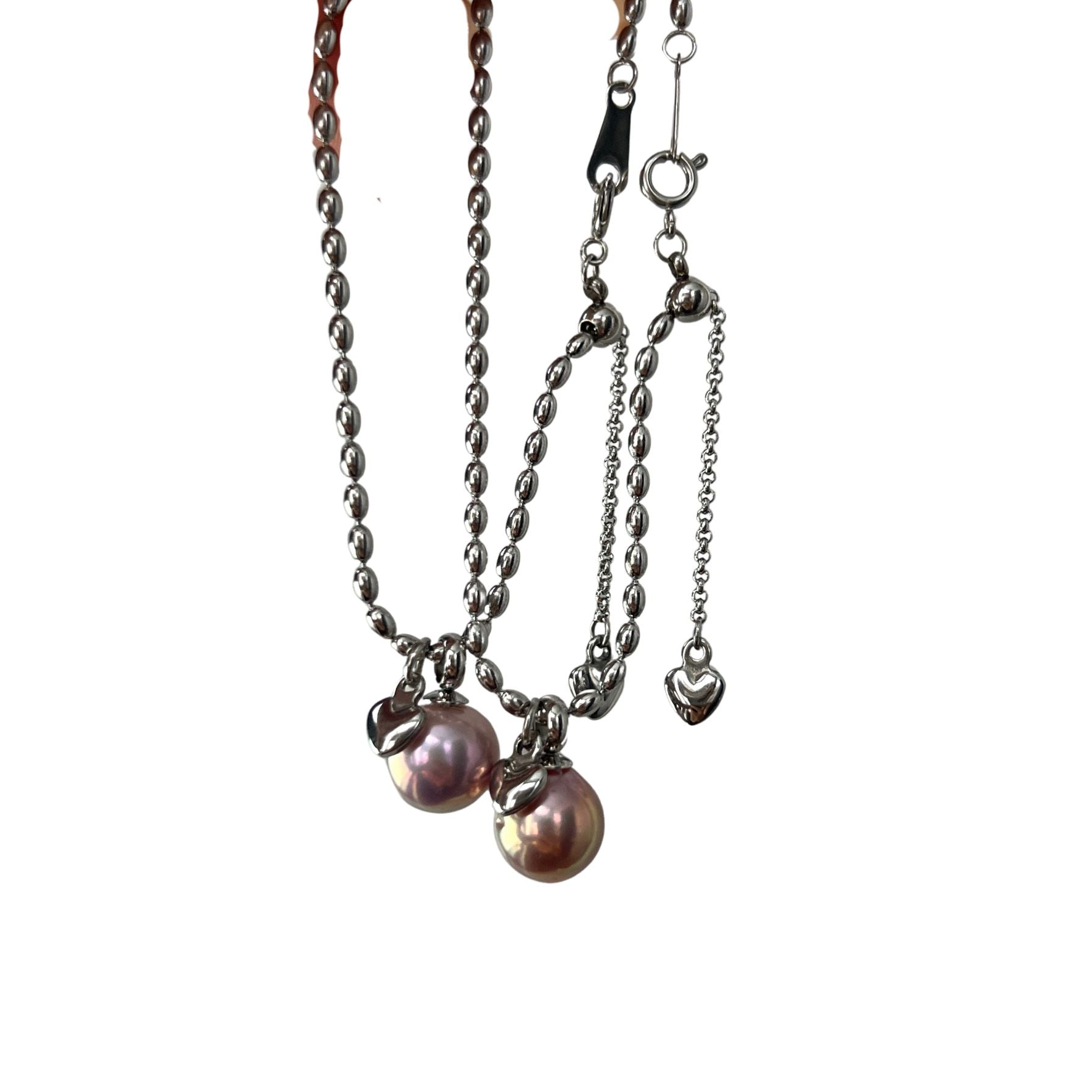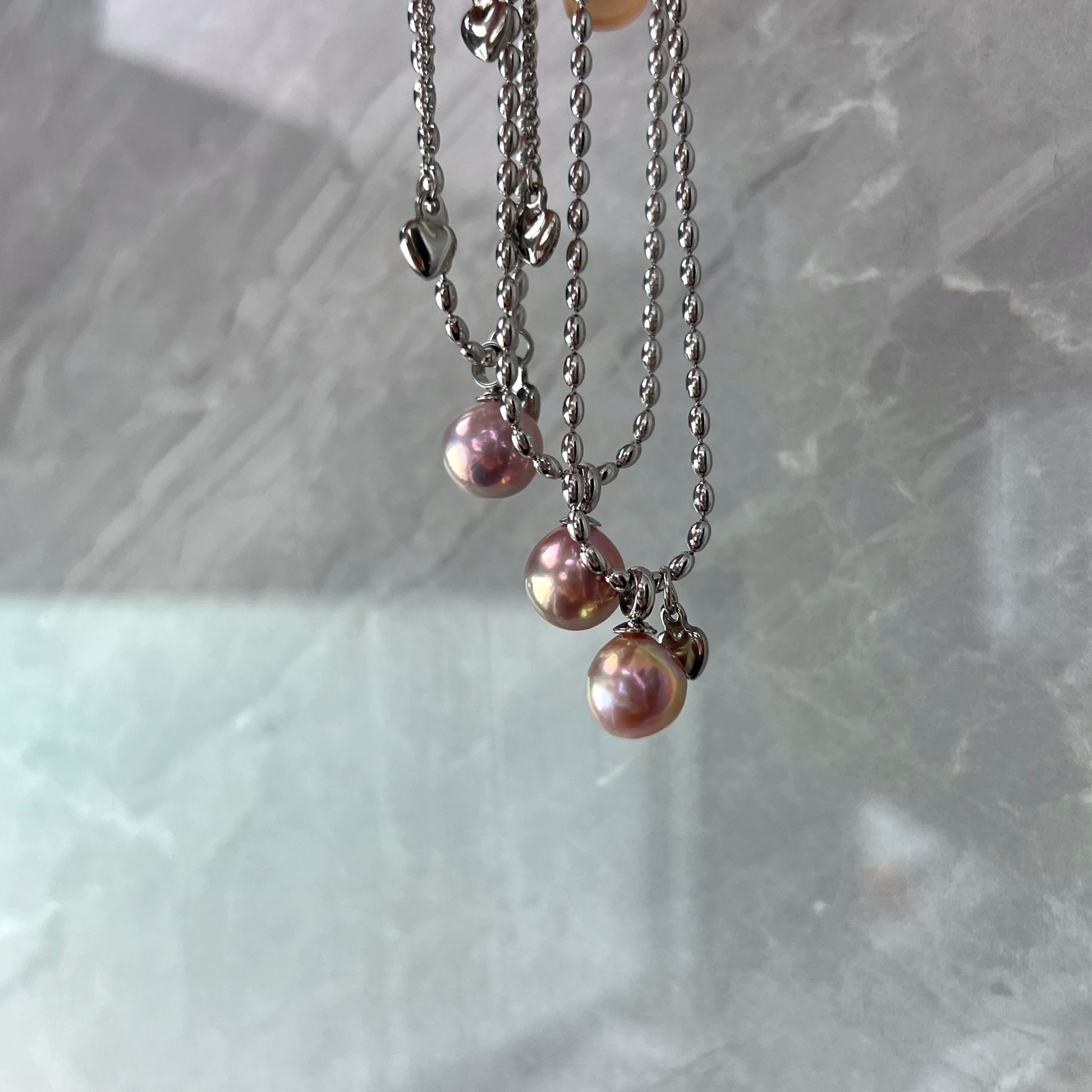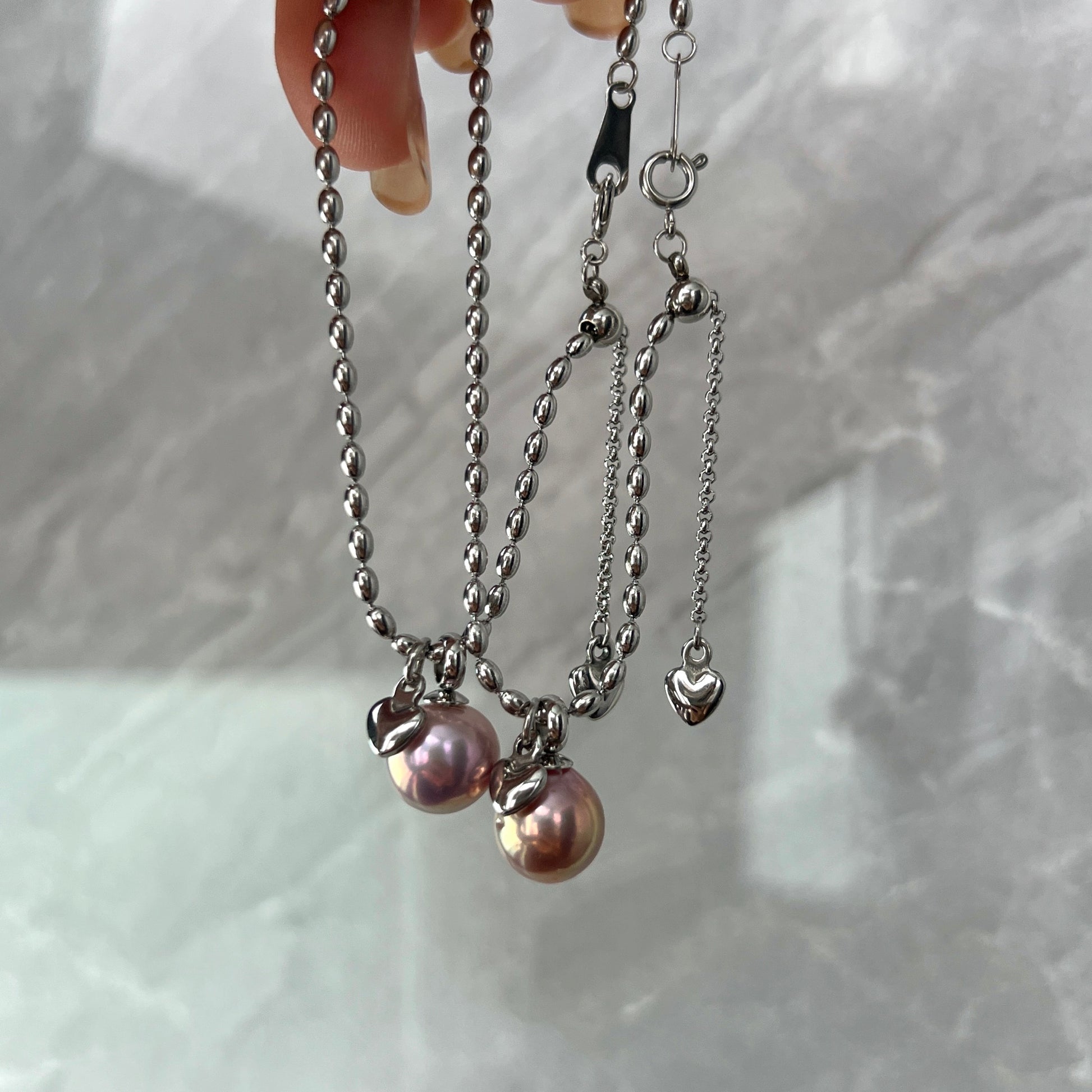 he chains are made of titanium steel with a high-retention color plating, ensuring long-lasting wear and a polished finish. The pearls are 9-10mm baroque pearls with a unique avocado hue, adding a touch of elegance and sophistication to both the necklace and bracelet.