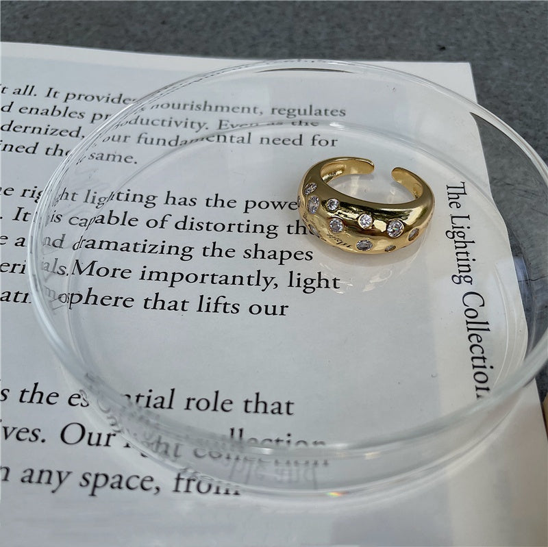 Gold-Plated Brass Open Ring, Crystal Pave, Circular Arc Design, Adjustable One Size