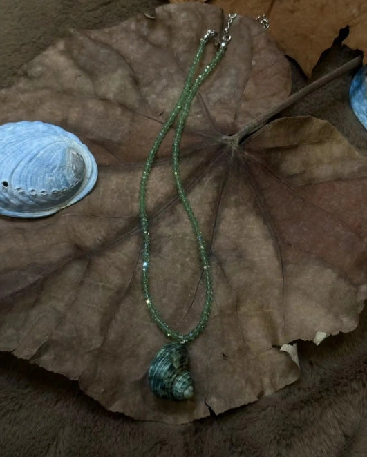 This is a handcrafted necklace featuring a green conch shell pendant paired with green beaded strands, embodying ocean elements and a unique design. It's a perfect gift for those who admire the sea's charm and distinctive craftsmanship.