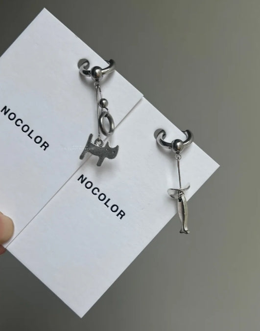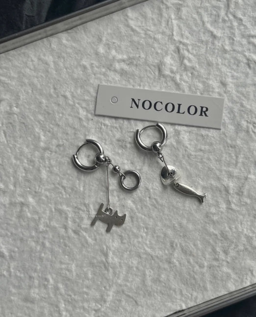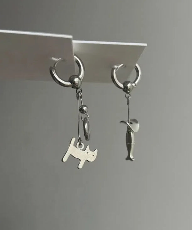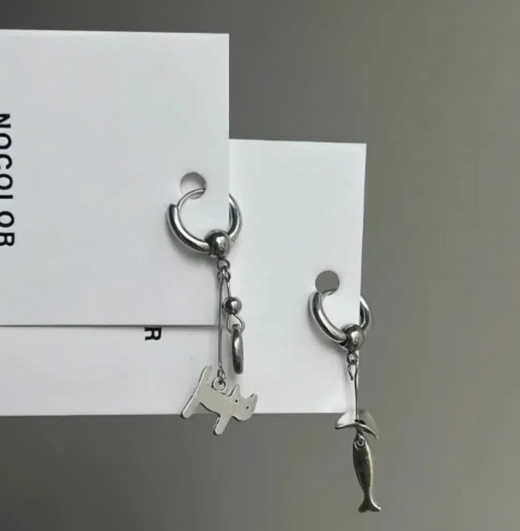 Handcrafted pair of earrings featuring kitten and fish pendants,designed with silver-tone metal, playful and fun design,a perfect gift.