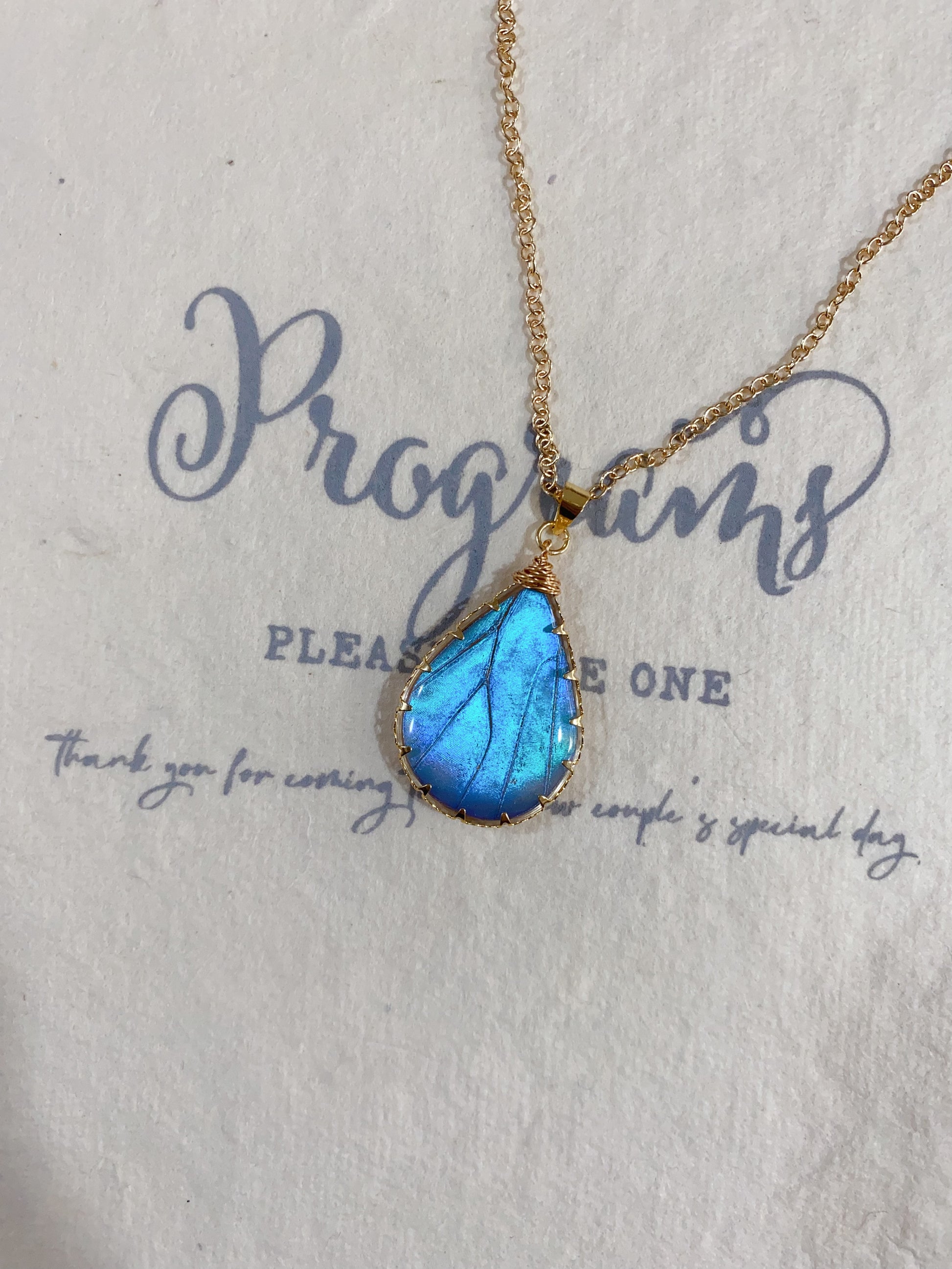 Handcrafted Sapphire Butterfly Wing Pendant, Blue Waterdrop Choker Necklace