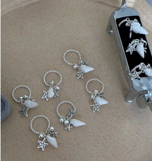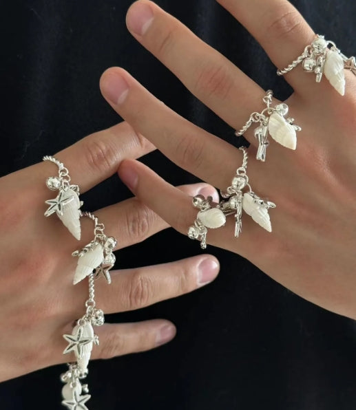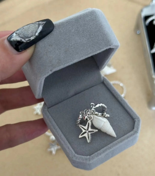 This is a handcrafted ring with a conch and starfish pendant, made from natural conch shells, featuring a unique and niche design. It makes a perfect gift for those who appreciate the charm of the sea.