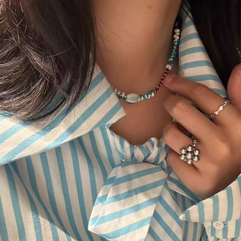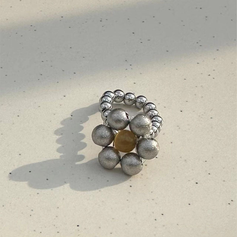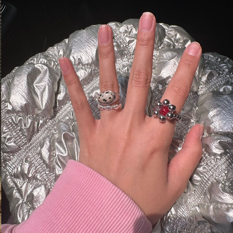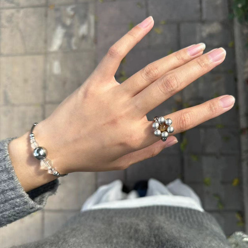 Handmade Beaded Flower Rings Cute Vintage Titanium Steel Bead Jade Finger Rings for Women Jewelry