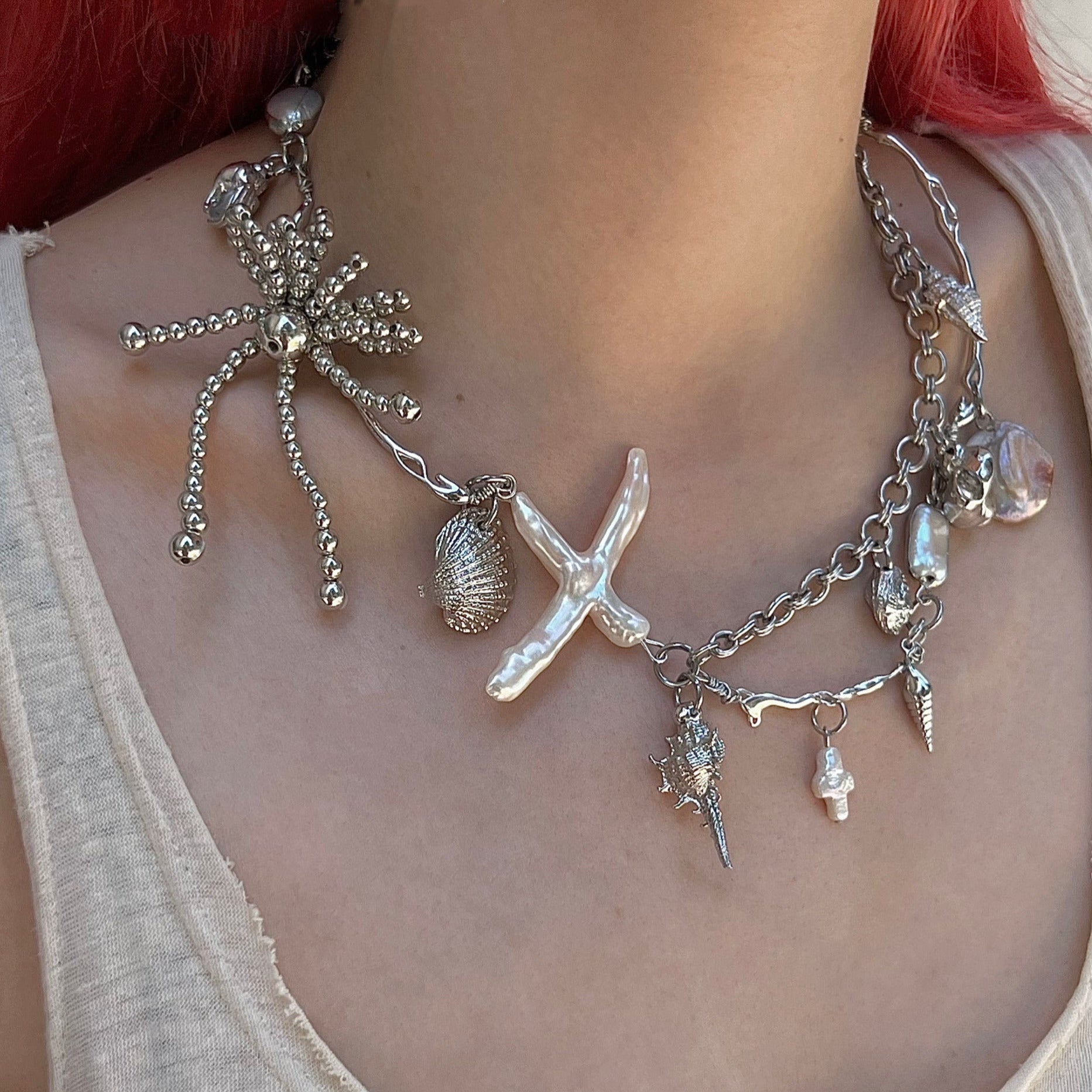 The necklace is made of natural baroque pearls, mother-of-pearl. The chain body fittings and tail buckle made of titanium steel.