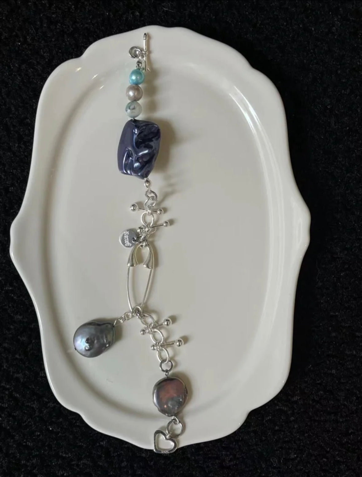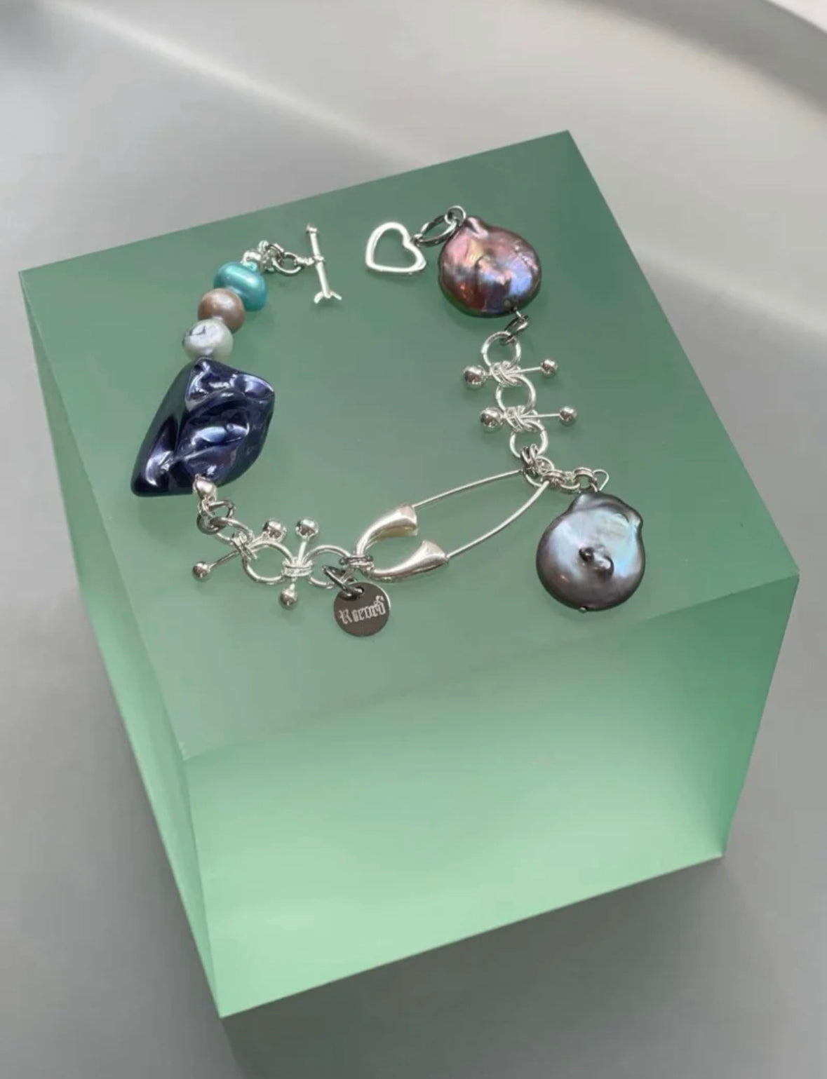 Handmade Shell Pearl Beaded Sliver Chunky Niche Punk Trendy Fashion Bracelet with Paper Clip and Pin