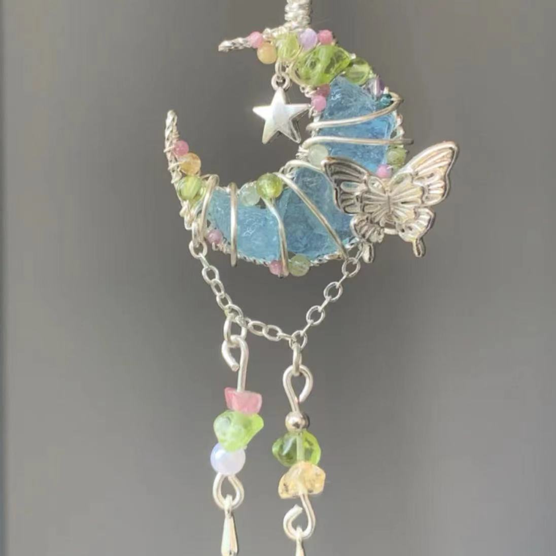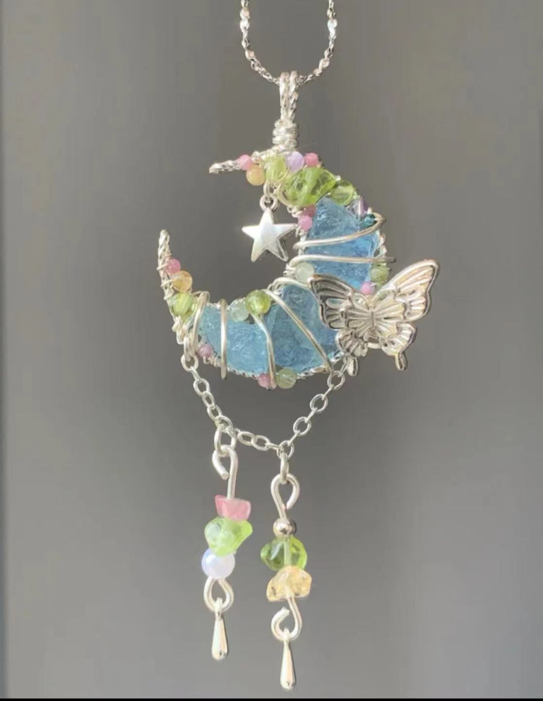 Moon-shaped blue crystal pendant necklace, adorned with butterfly and multicolored floral crystal elements, silver chain, unique handmade crystal necklace.