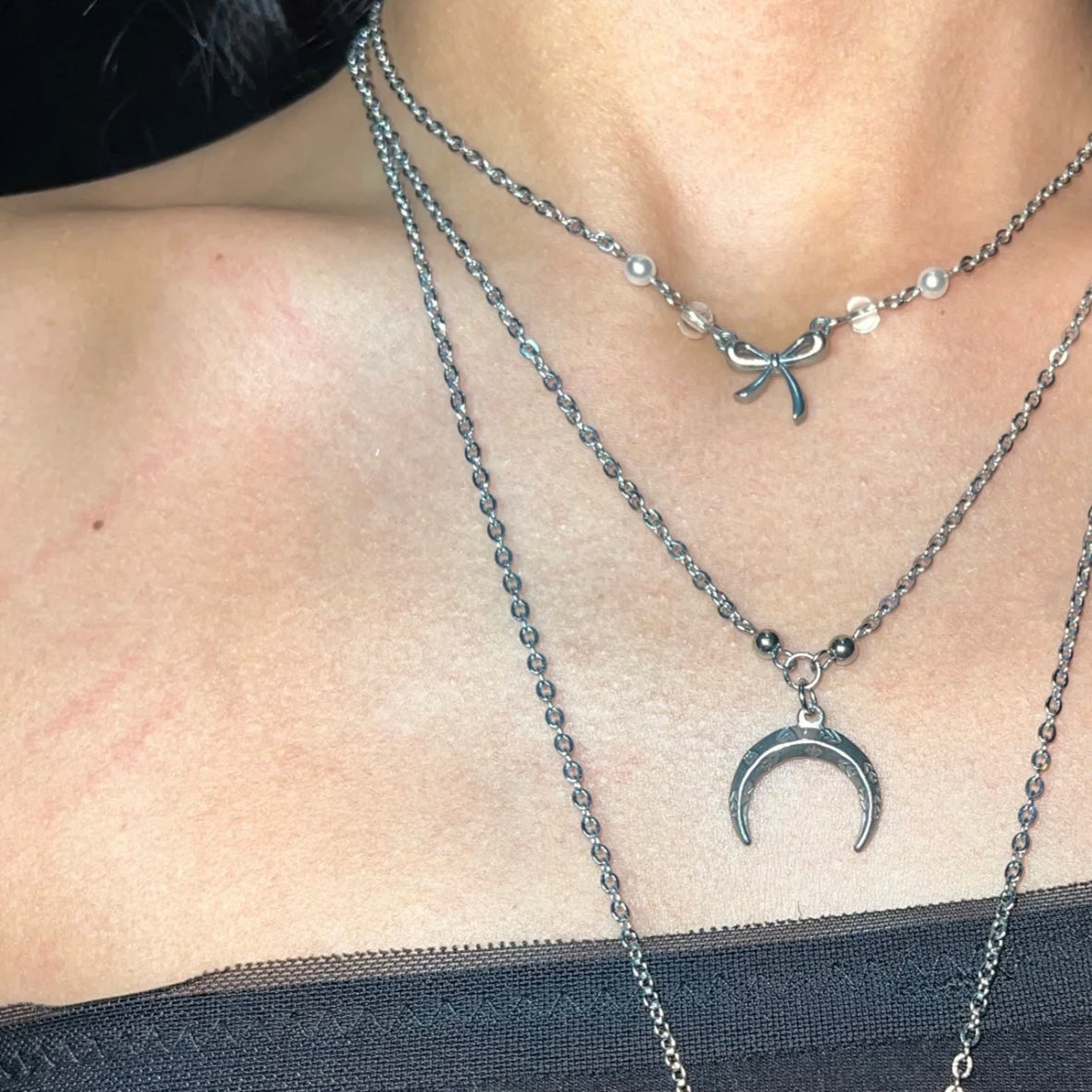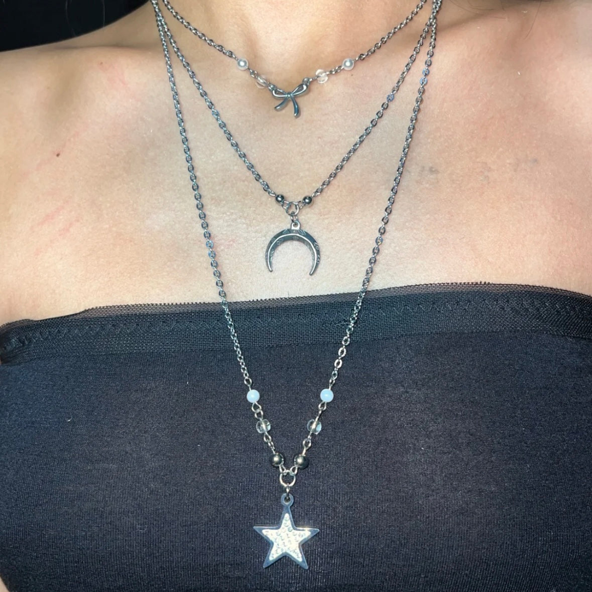 Moon Star Bownot Choker Dainty Pendant Trendy Layered Necklace Silver Chain for Women