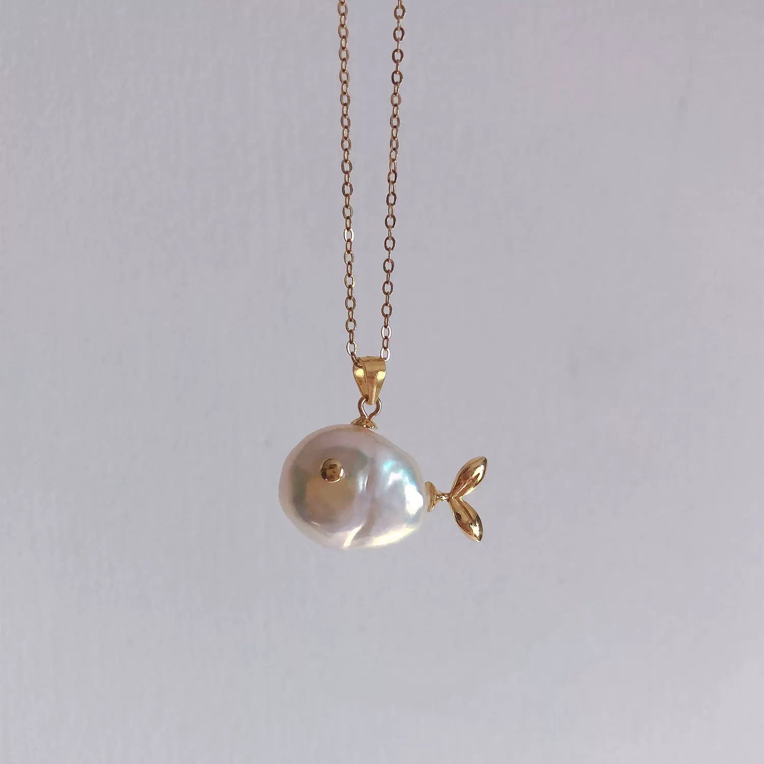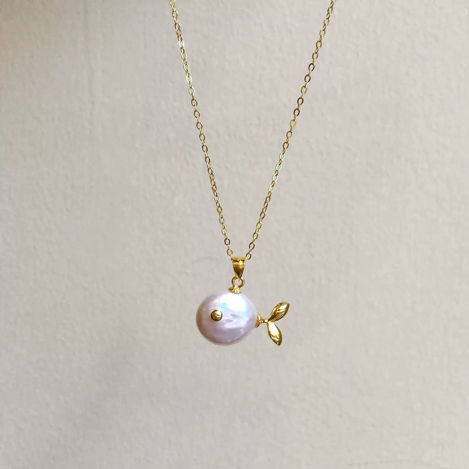 Embrace the magic of the ocean depths with this captivating necklace, featuring a captivating combination of a natural baroque pearl, an aurora borealis button, and a whimsical fish pendant.
