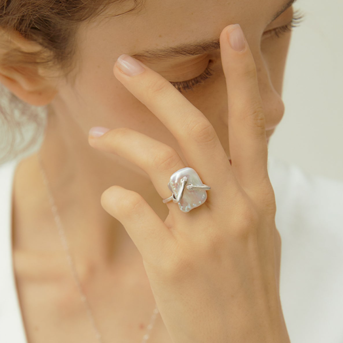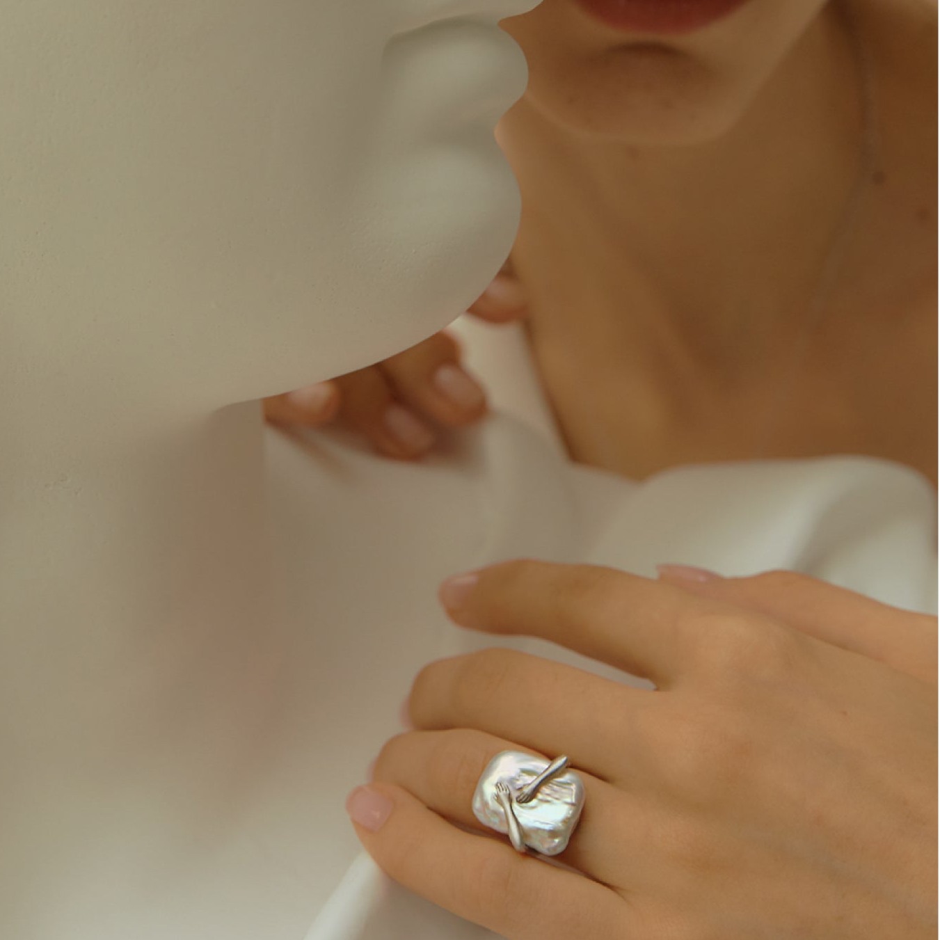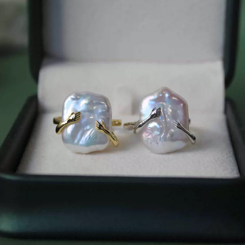 Natural Square Pearl Embrace Ring in S925 Sterling Silver, Adjustable Open Ring