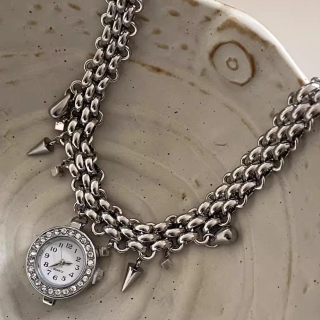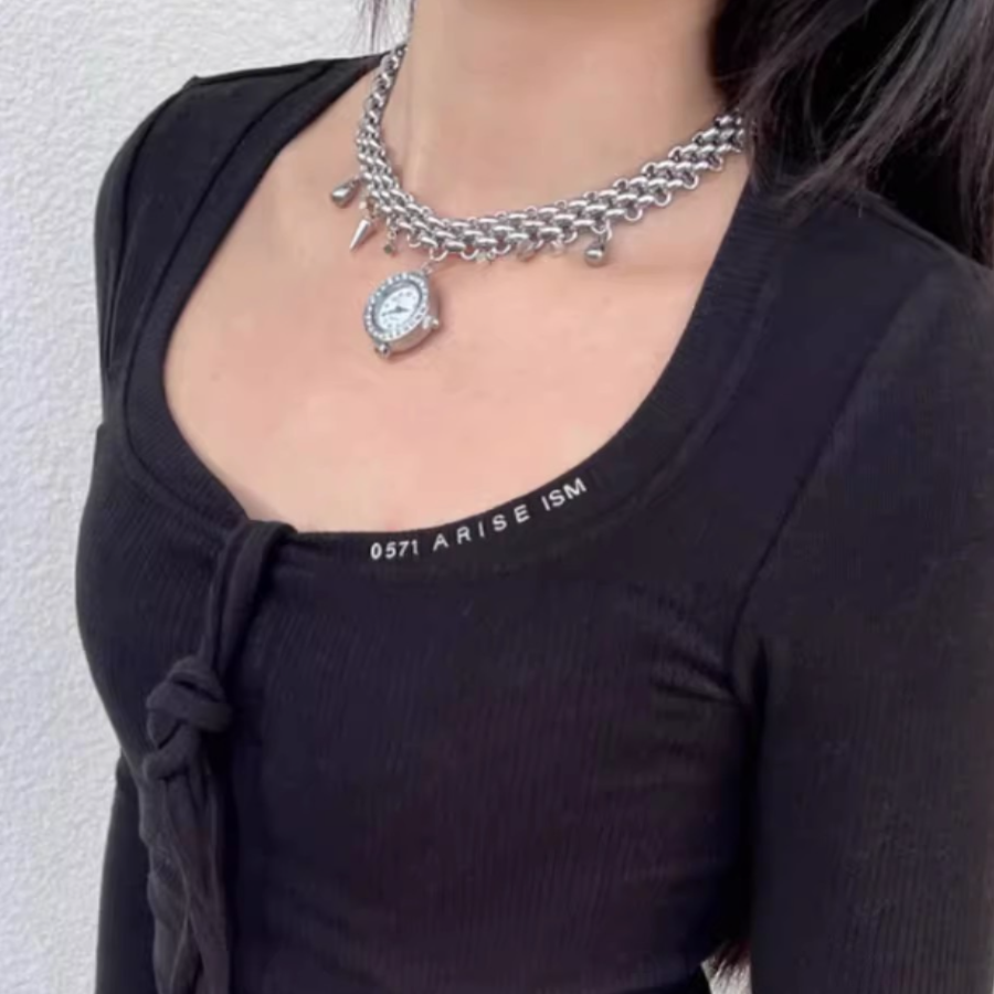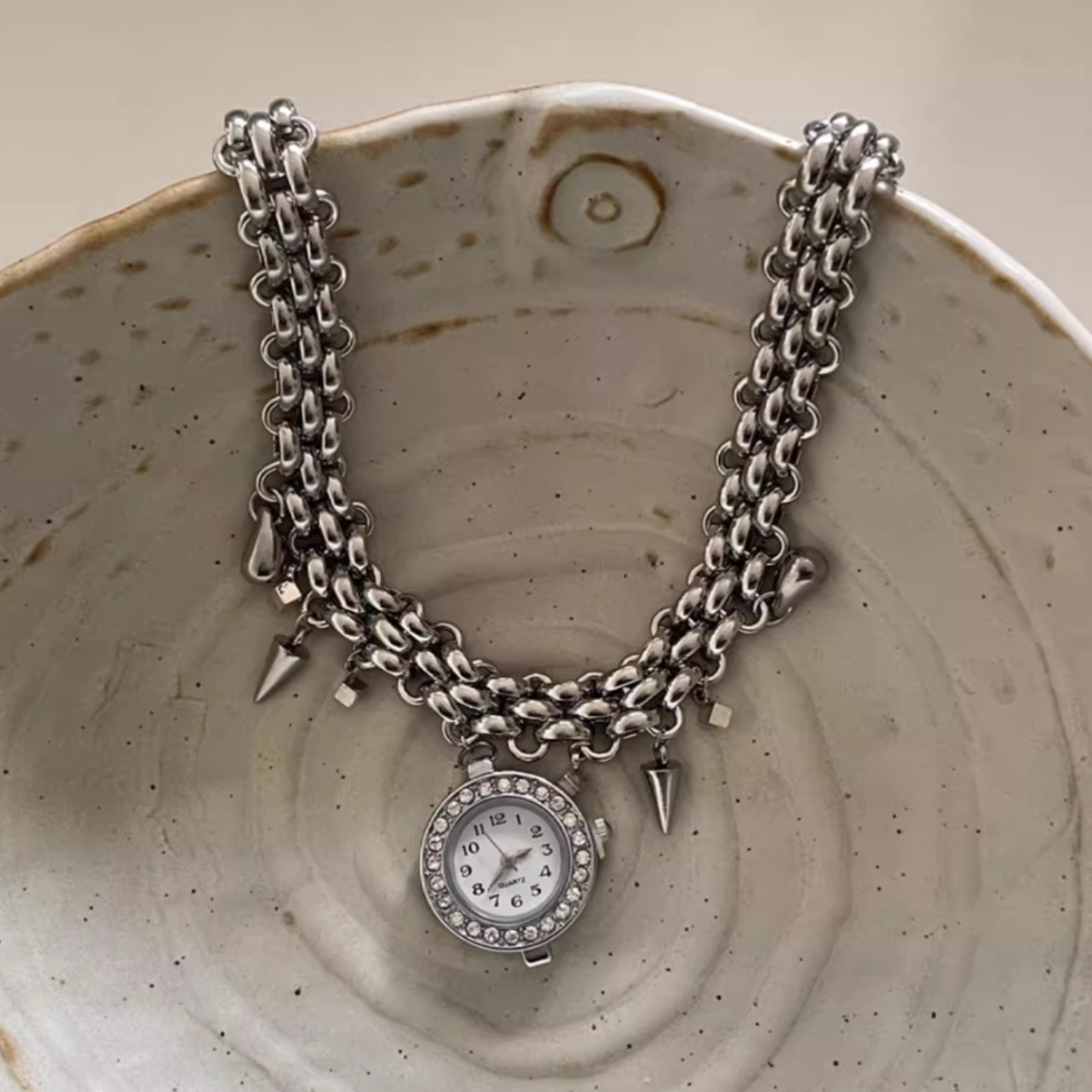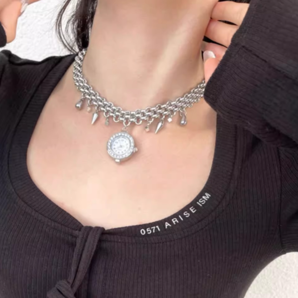 Cyberpunk Silver Vintage Watch Necklace, Gothic Punk Style, Metallic Y2K Necklace, Elegant and Fashionable, Unisex Necklace