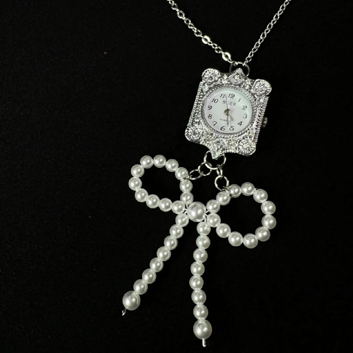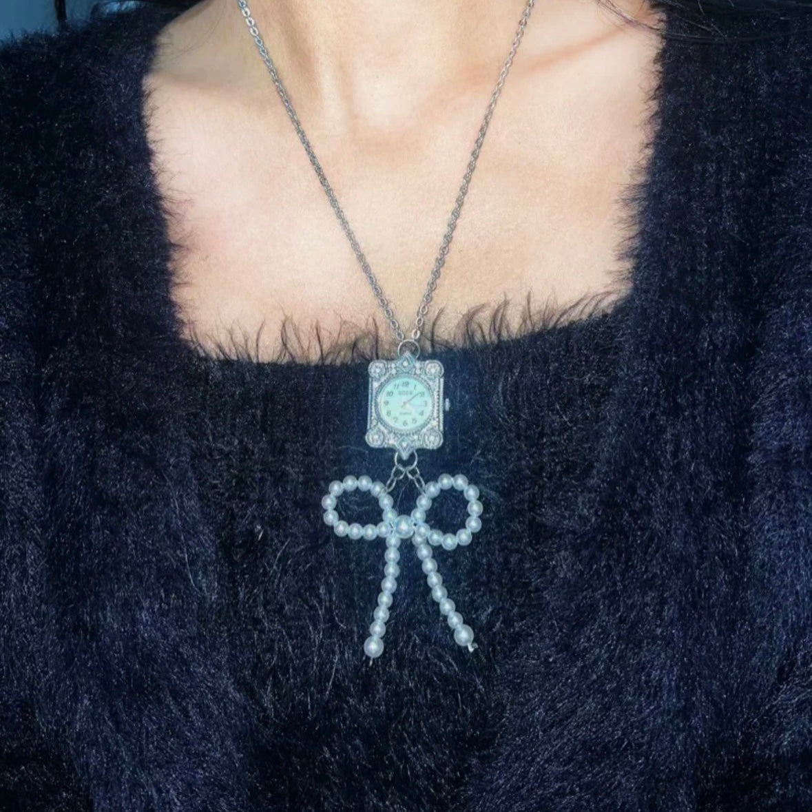 A classy watch necklace paired with a pearl bow adds some elegance and cuteness to your temperament. Wearing it makes you look more unique.