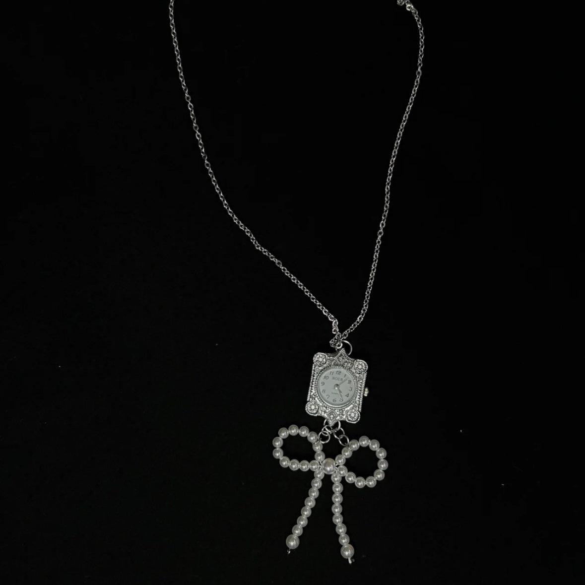 Pearl Bownot Watch Choker Niche Punk Chunky Pendant Necklace Silver Chain Vintage Jewelry