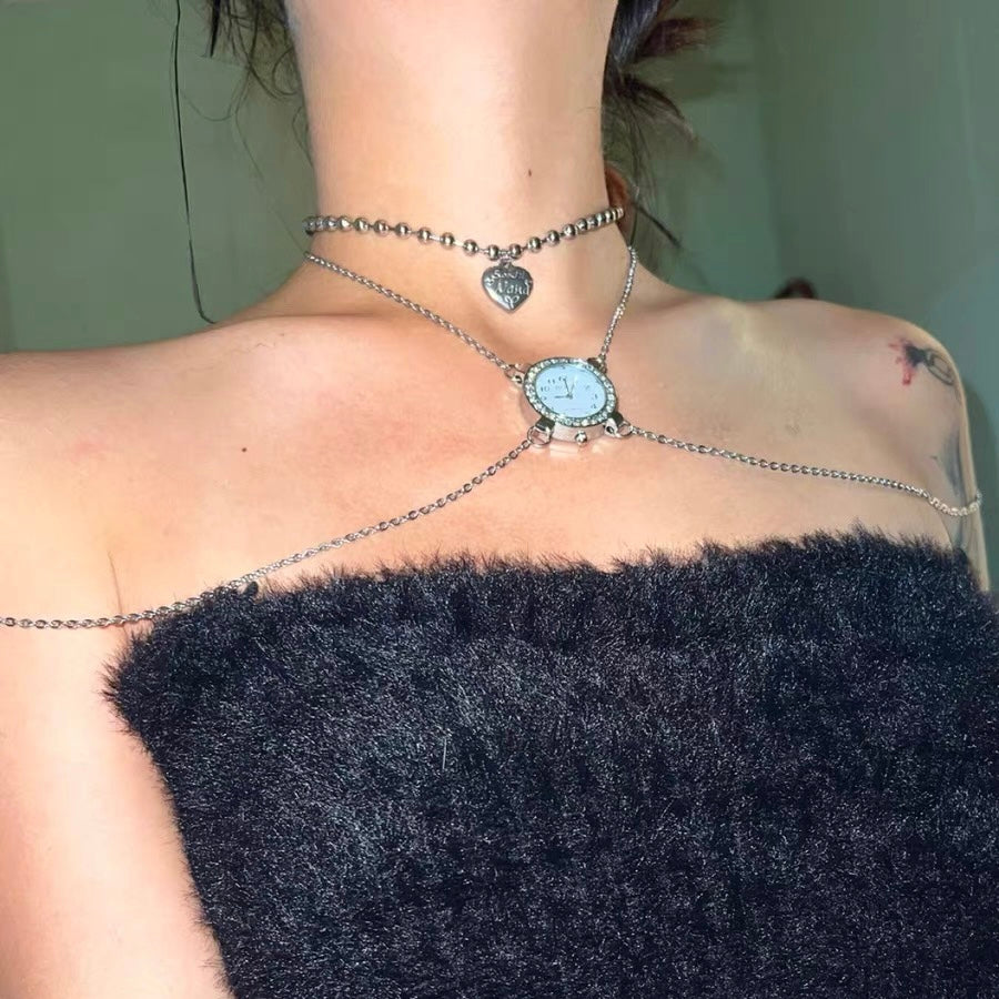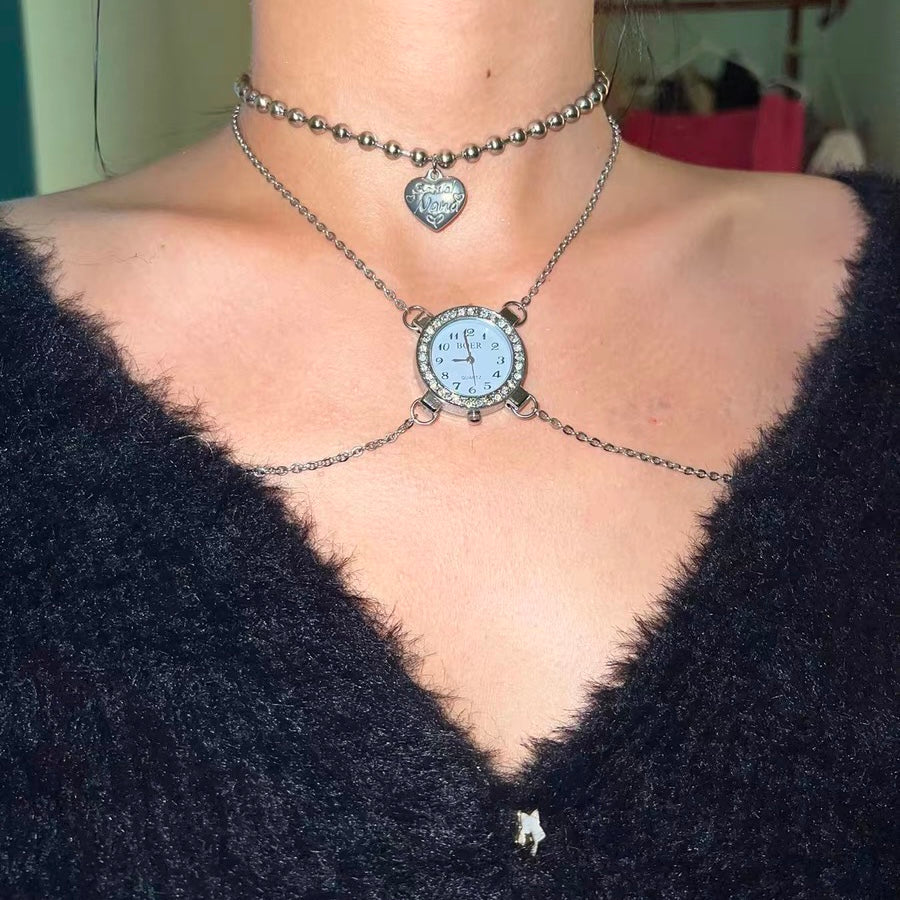 Silver Heart Rhinestone Watch Choker, Chunk Punk Necklace Chain Neck Jewerly for Women,