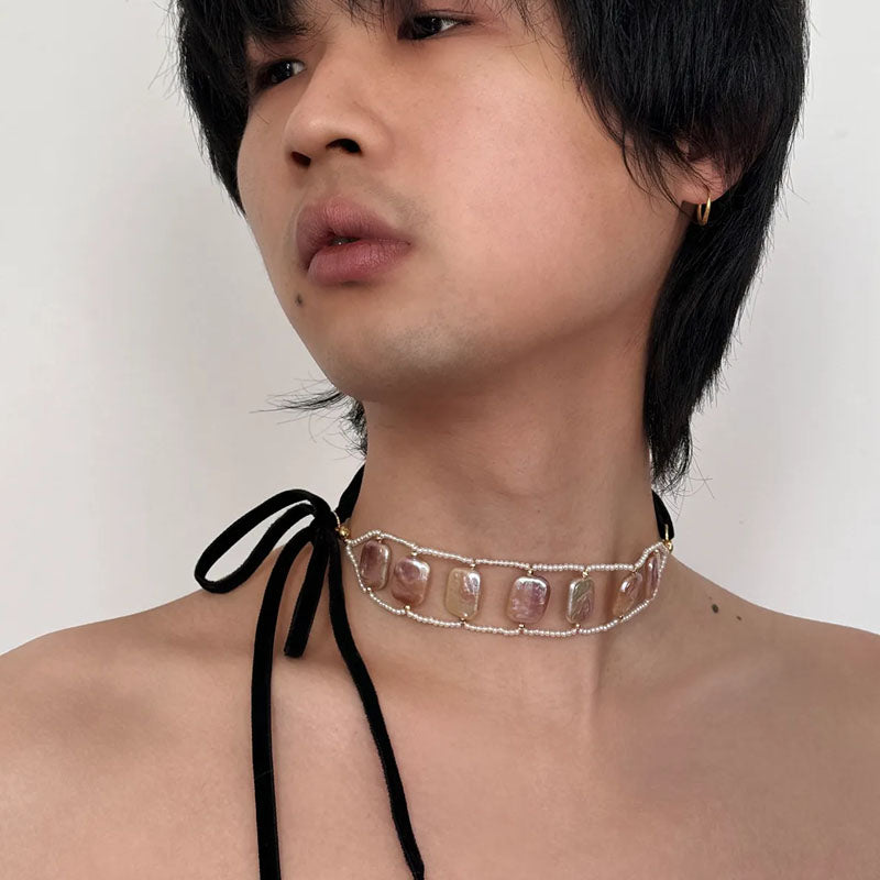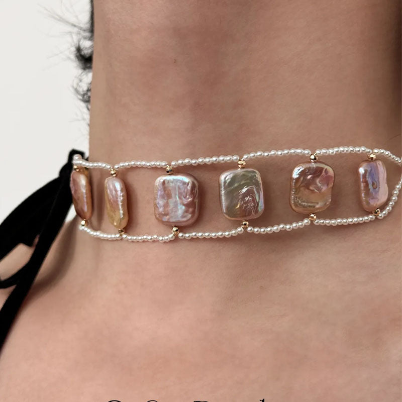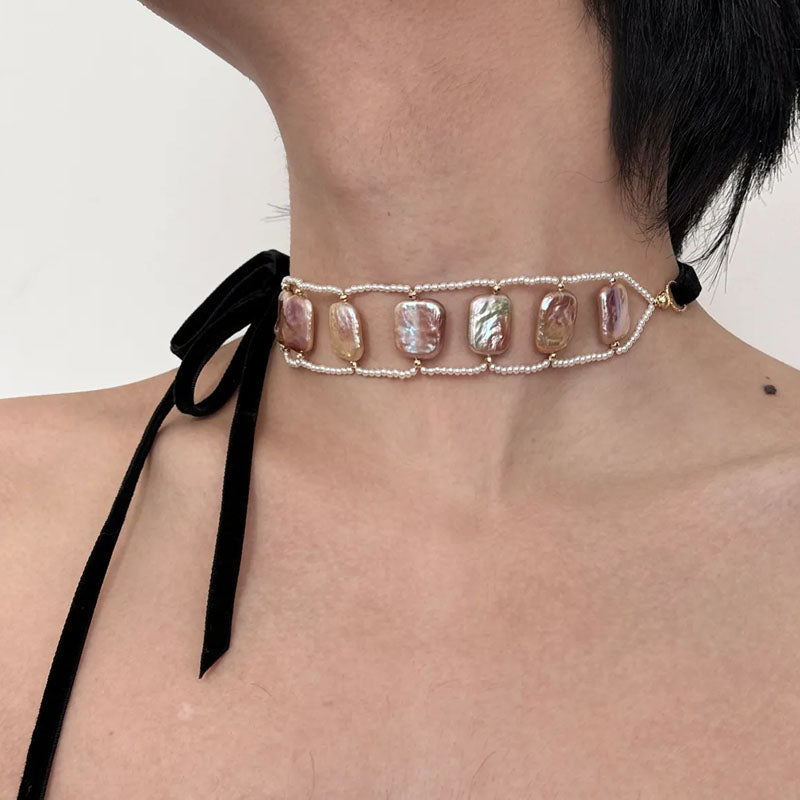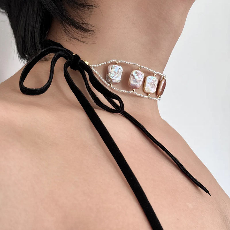【Material】Natural Baroque Pearl Glass Pearl Alloy Velvet Belt