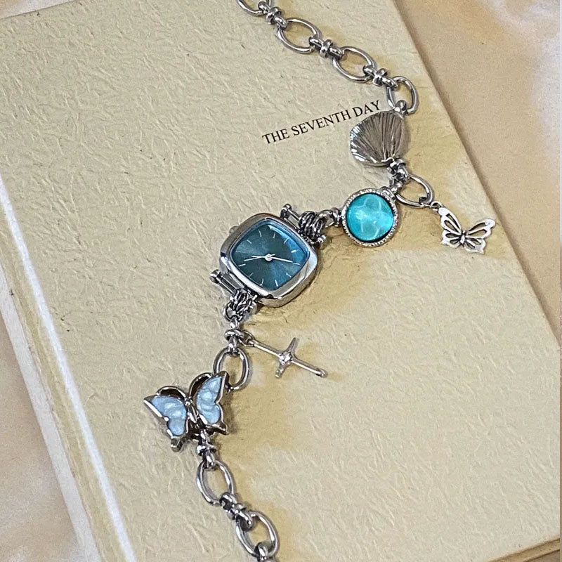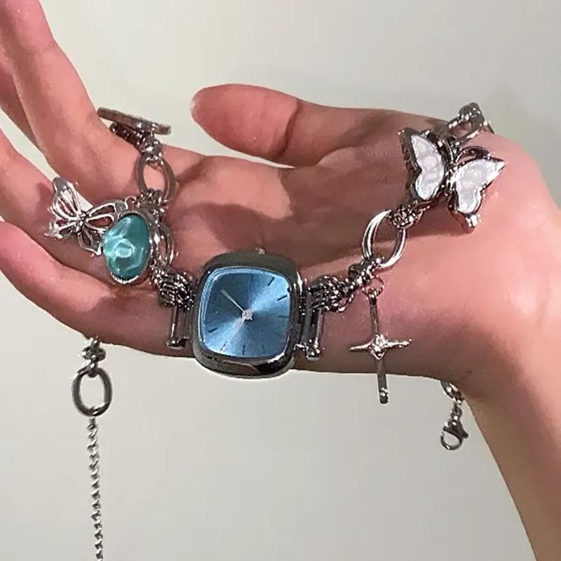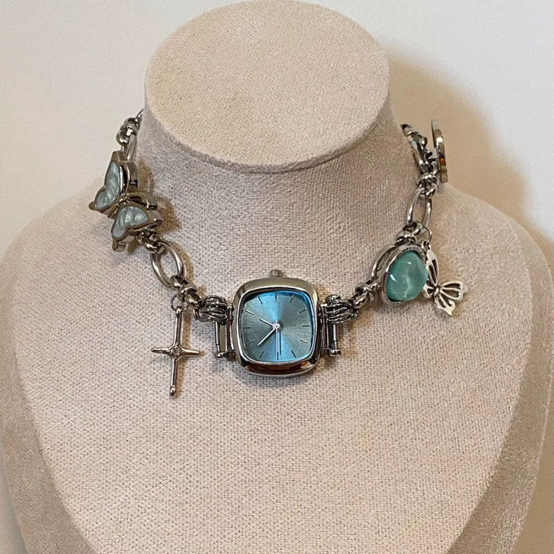 Vintage Chunky Metal Chain Necklace Blue Watch Pendant Choker, Fashion Punk Jewelry, Y2KAccessories, Perfect Unique Handmade Gift