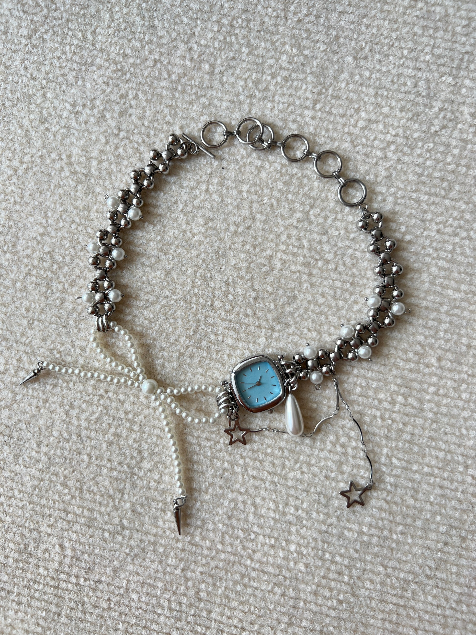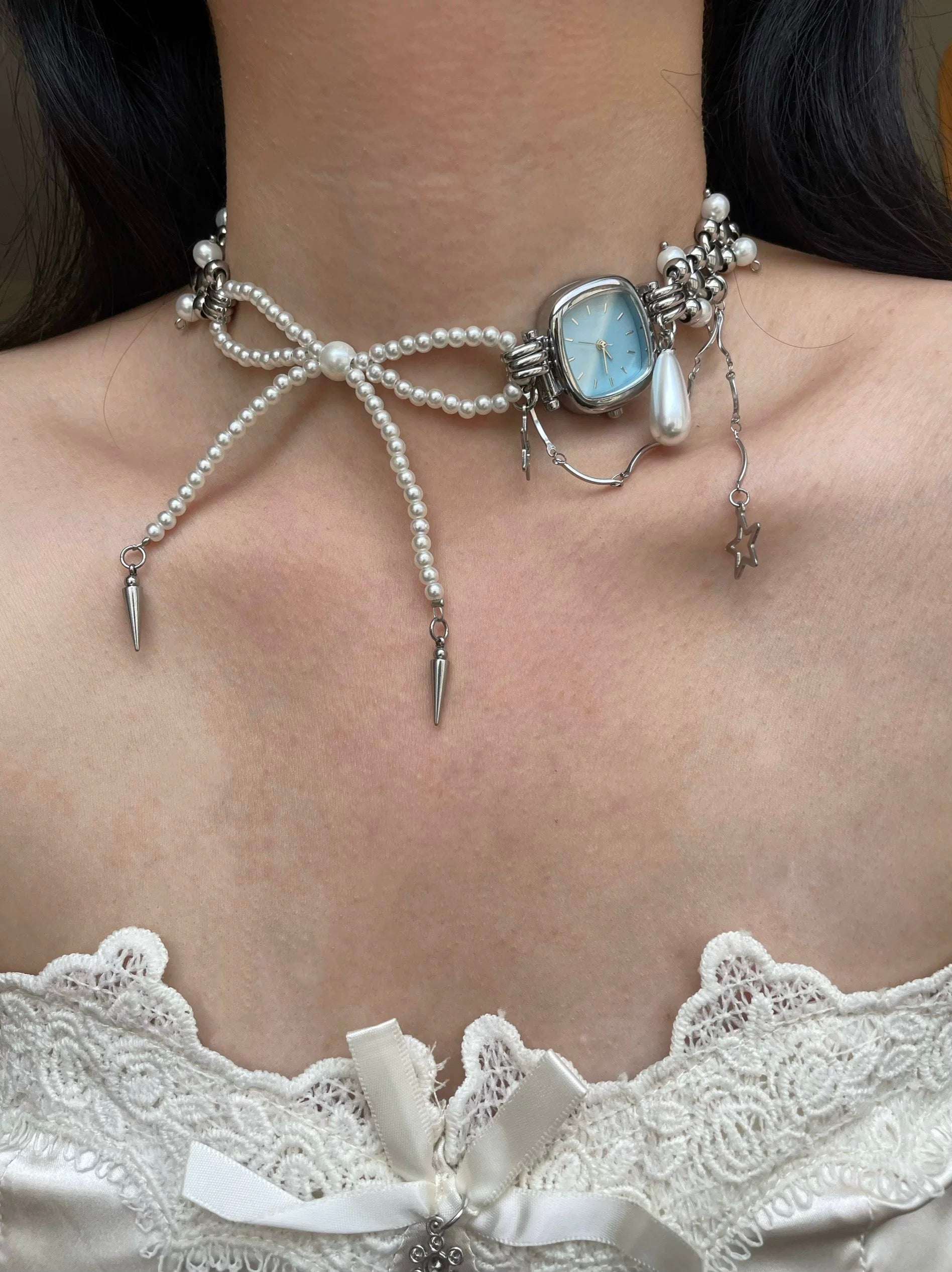Vintage Elegant Pearl Watch Choker Necklace, Bow Pearl Necklace, Y2K Pearl BlueWatch Necklaces, Niche Punk, Perfect Unique Handmade Gift.