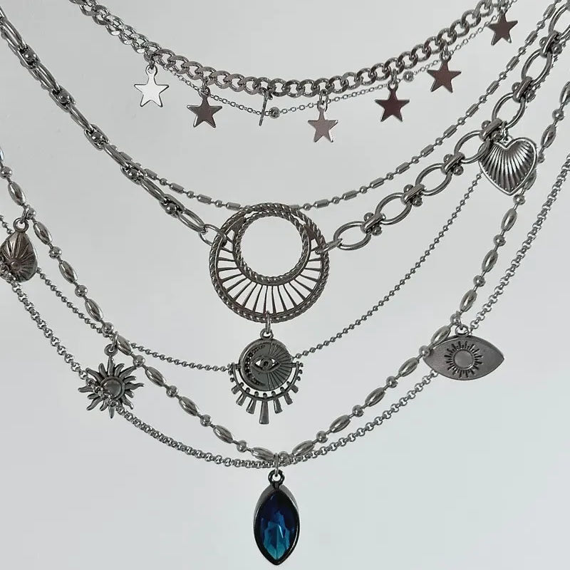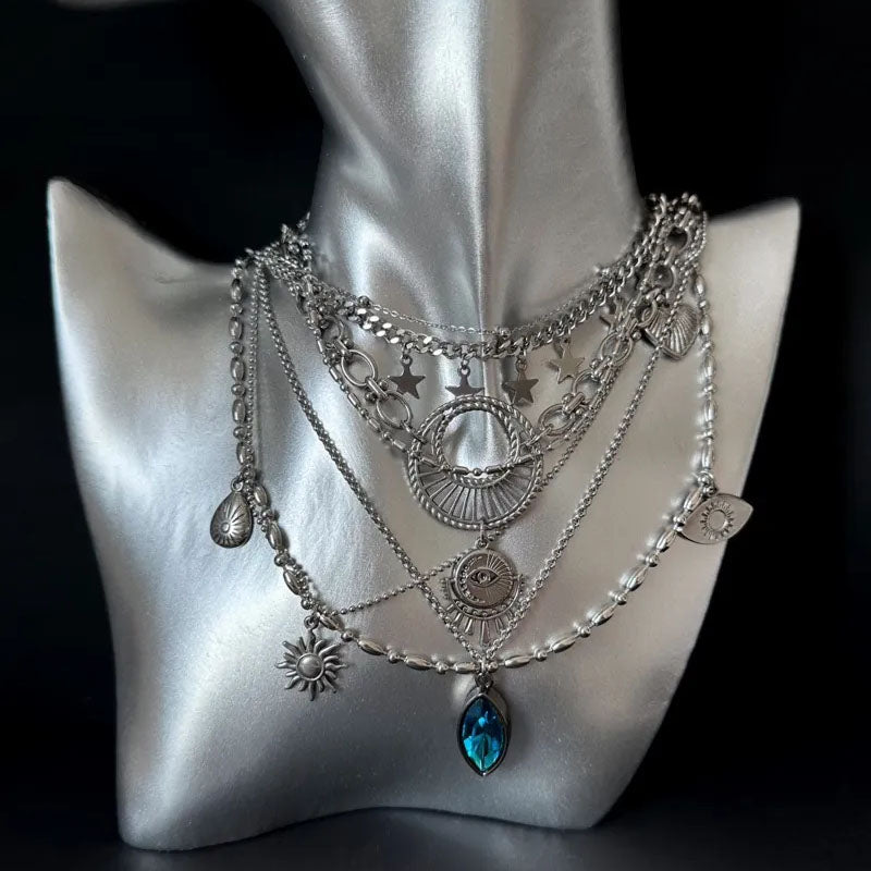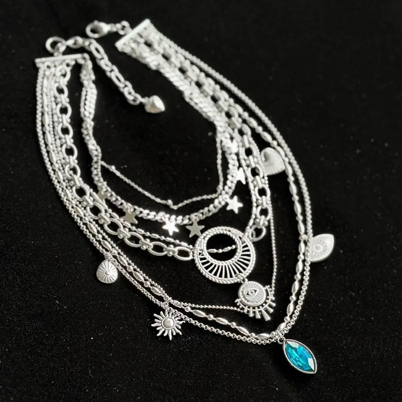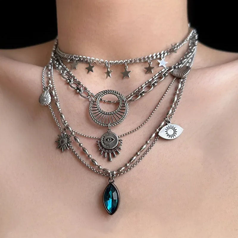 Vintage punk style, lapis lazuli, stars, eye of God, heart pendant silver layered necklace, exotic elegance, niche personality, perfect unique gift.