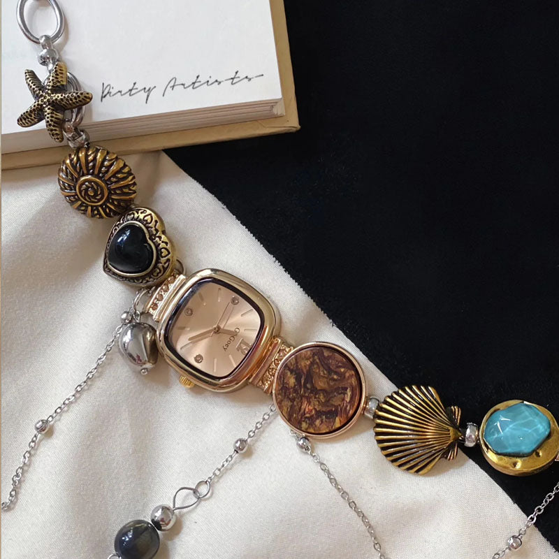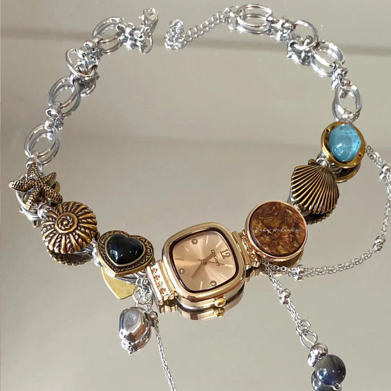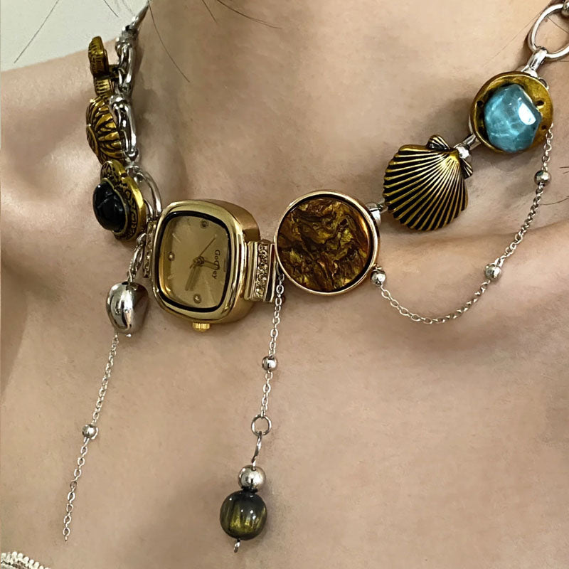 Vintage Necklace Y2K Punk Handmade Button Bead Watch Pendant Choker Titanium Steel Necklace, Unique Jewelry Gift for Women and Man
