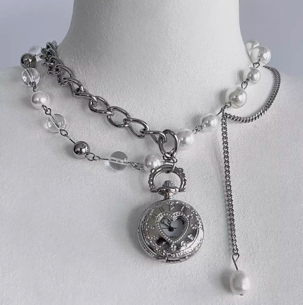 Vintage Punk Silver Pocket Watch Necklace, Double-layer Pearl Necklace,chunky chain choker,Y2Kchoker,Exquisite and perfect gift,Unisexchoker