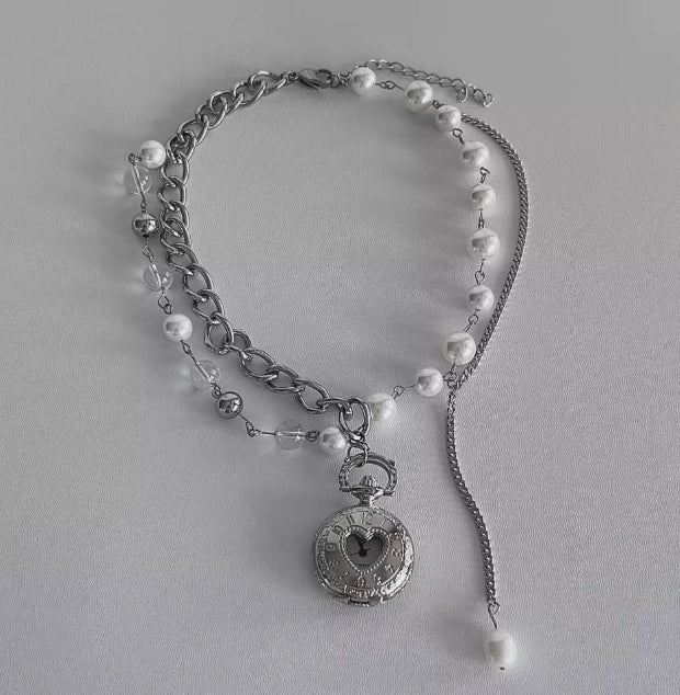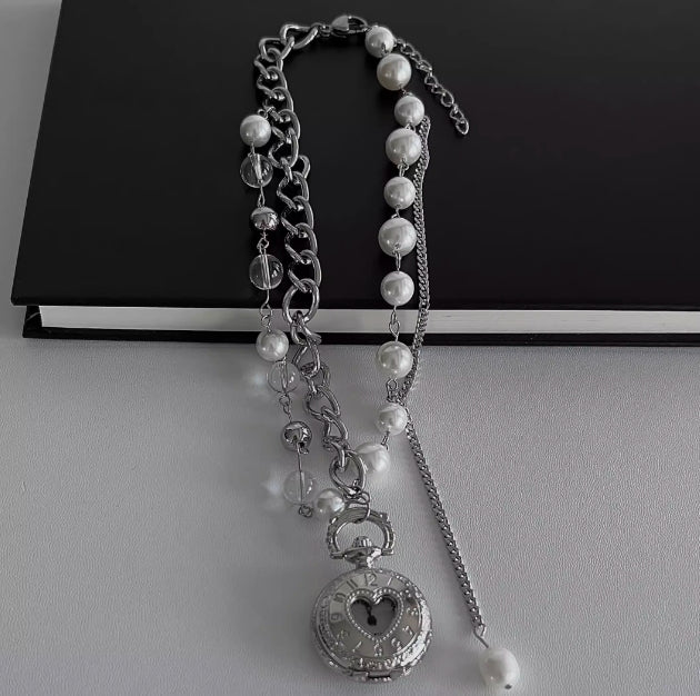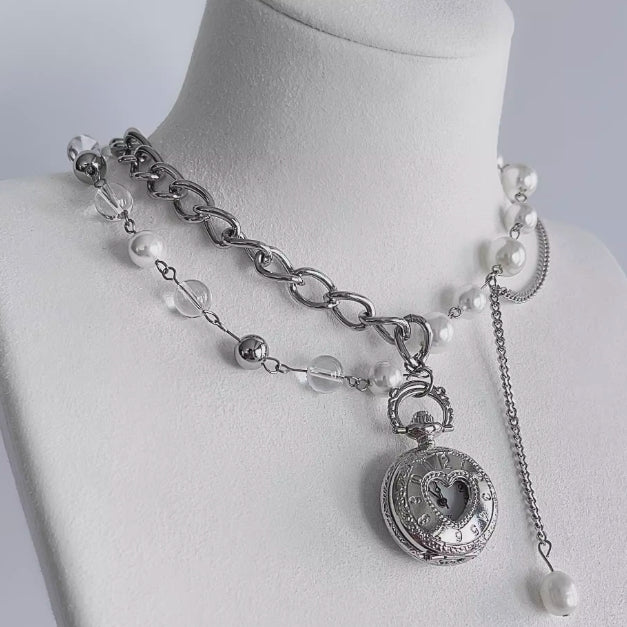 This is a pocket watch-inspired necklace, featuring a silver double-layer design with pearl embellishments, showcasing an elegant and classic aesthetic.